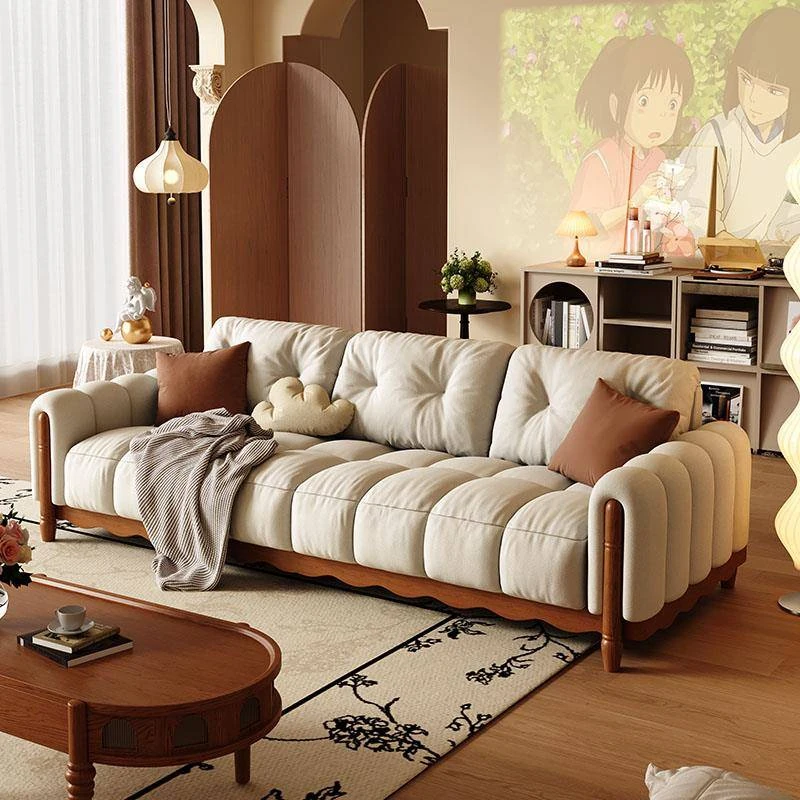カダダホームスタイルのクリーミーな無垢材ソファ - 北欧デザイン、小さな部屋にもぴったりな和風ファブリックソファで、快適なリビングを演出します。