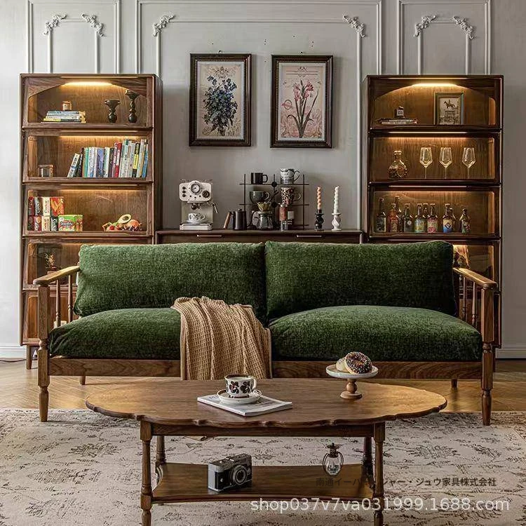 2024年新作!フランス風クリームスタイルのヴィンテージ木製ソファ、エレガントな深緑色が魅力のアメリカンピアノキーリビングルーム向け、コンパクトな小型サイズでおしゃれな空間を演出します!