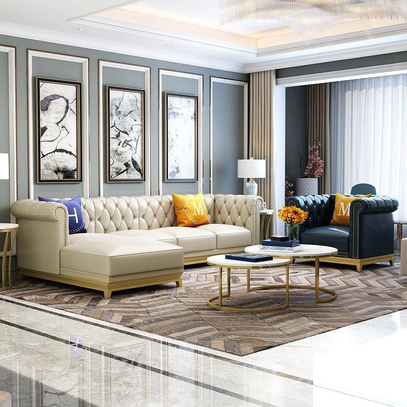 新中式デザインの本革&ファブリックソファセット - ヴィラのリビングルームに最適なラグジュアリー家具のスタイルサンプル!心地よい空間を演出します。