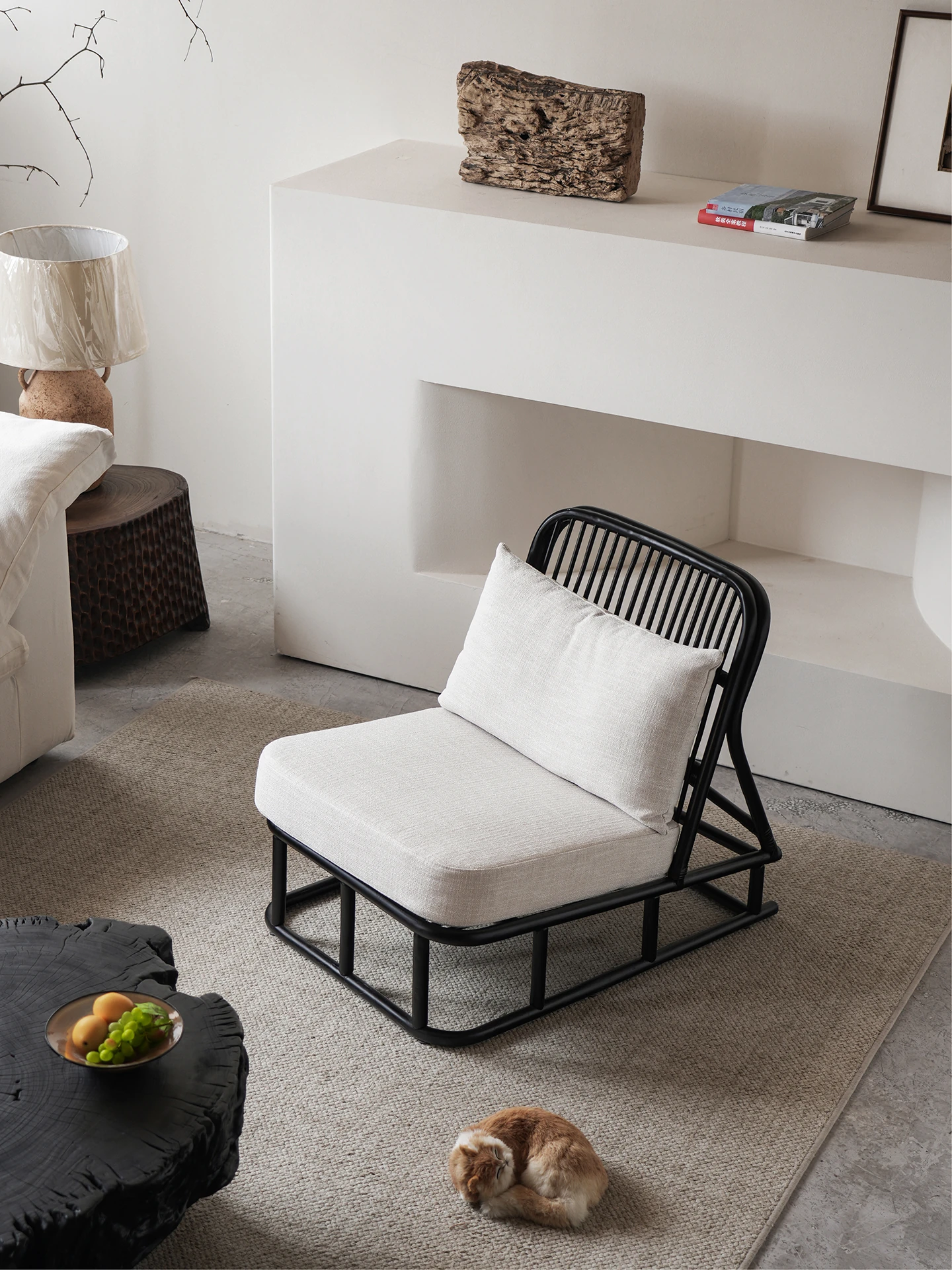 侘寂風のブラックバルコニー用シンプルリラックスチェア|デザイナーズスタイルの一人掛けソファ|モダンな民宿や寝室に最適なラウンジチェアで、くつろぎのひとときを演出します。