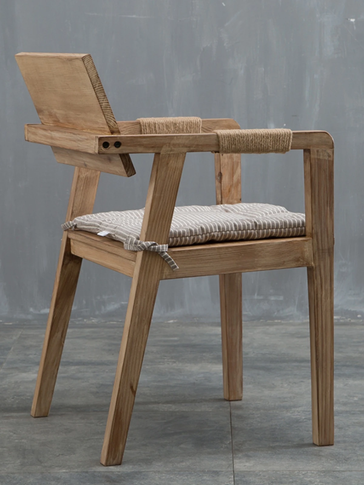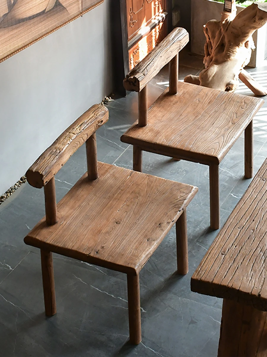 老朴な楡の木製椅子 - シンプルでリラックスした雰囲気、バルコニーやカフェに最適な和風レトロデザインの背もたれ付きダイニングチェア。自然の温もりを感じる一品を。