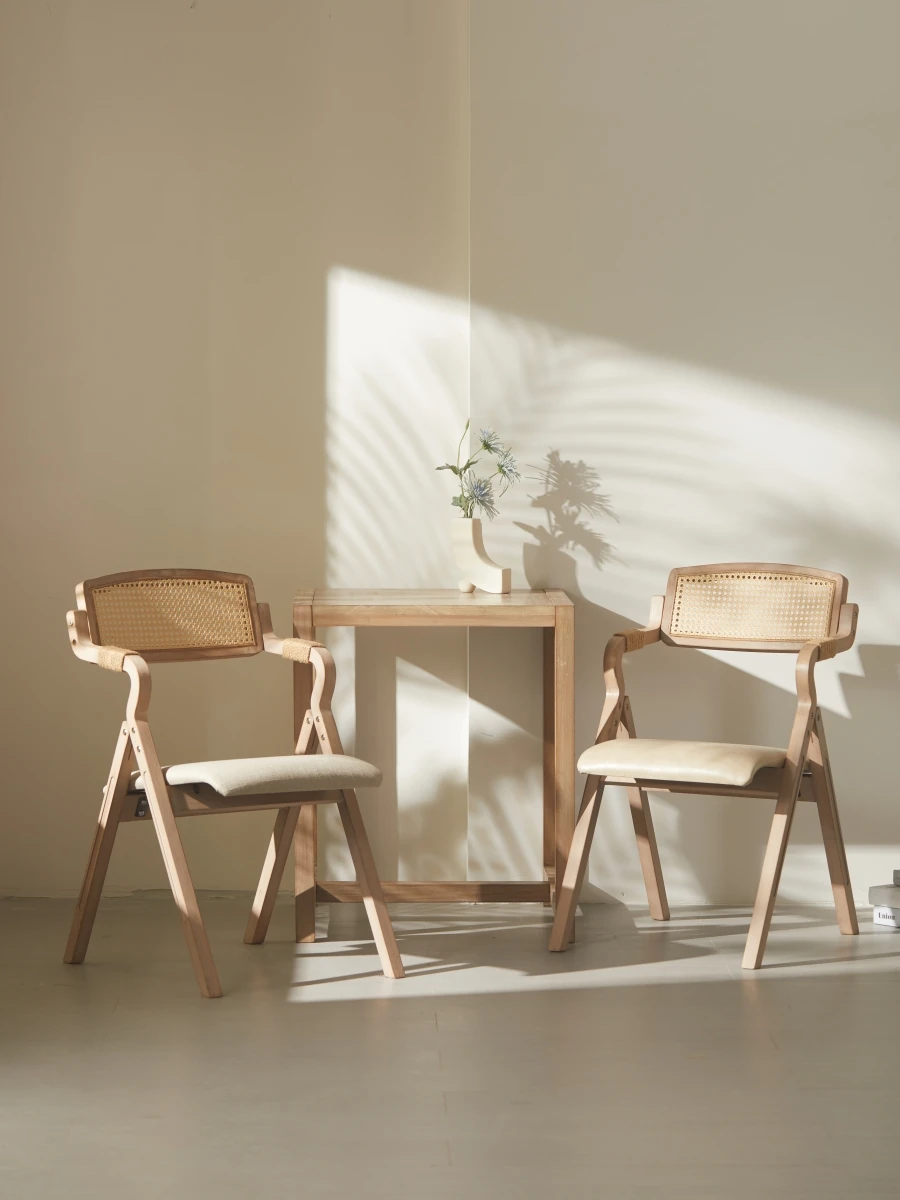 木製シンプルレトロ 藤の侘寂風 折りたたみアームチェア 布製クッション付き 家庭用 リラックスできるダイニング・書斎用 椅子 - 快適なひとときを演出します!
