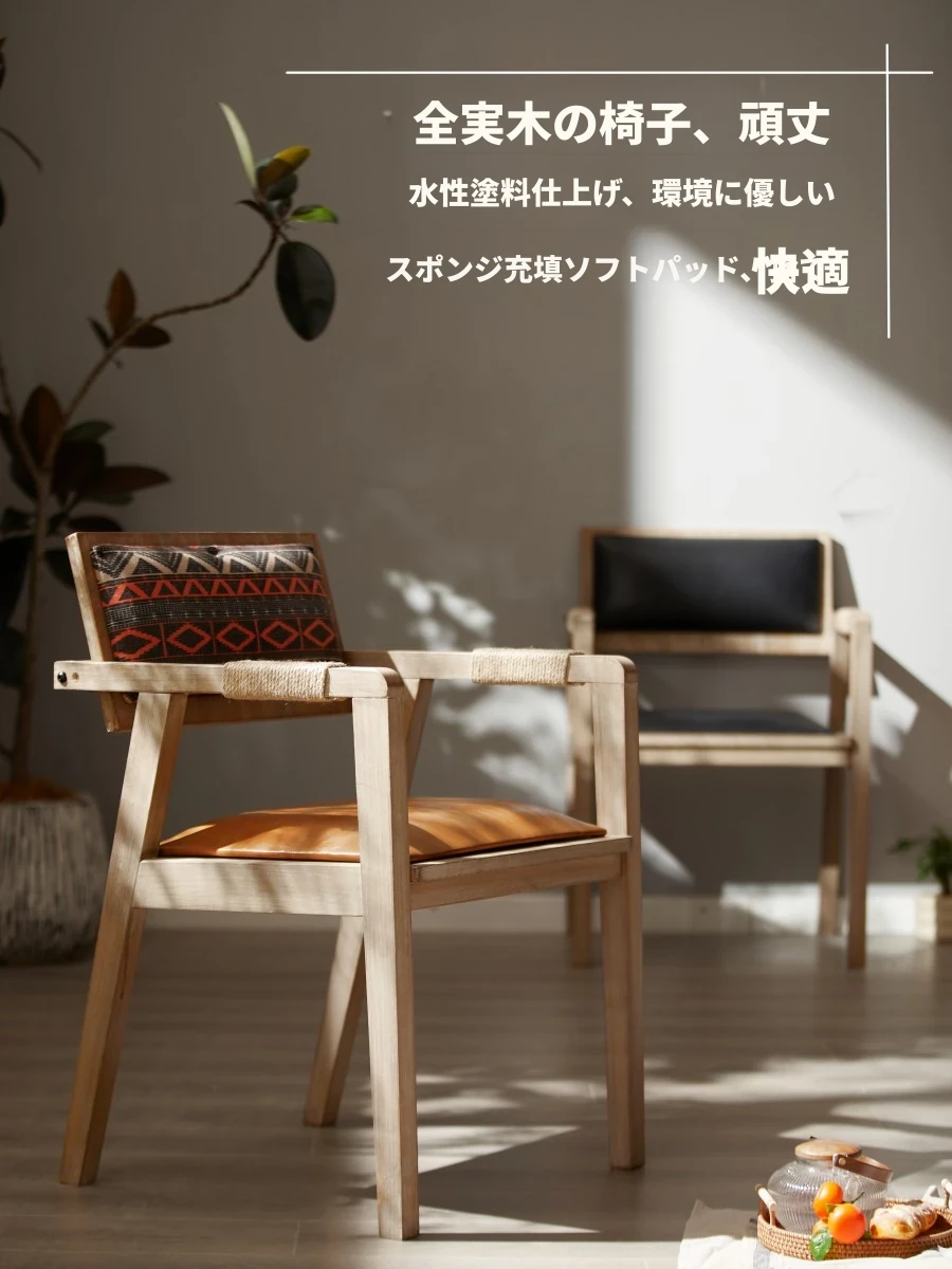梵辰モダンミニマリストビンテージスタイルの背もたれ付き無垢材アームチェア - ホテルやレストランに最適、長時間座っても快適なリラックスチェア!