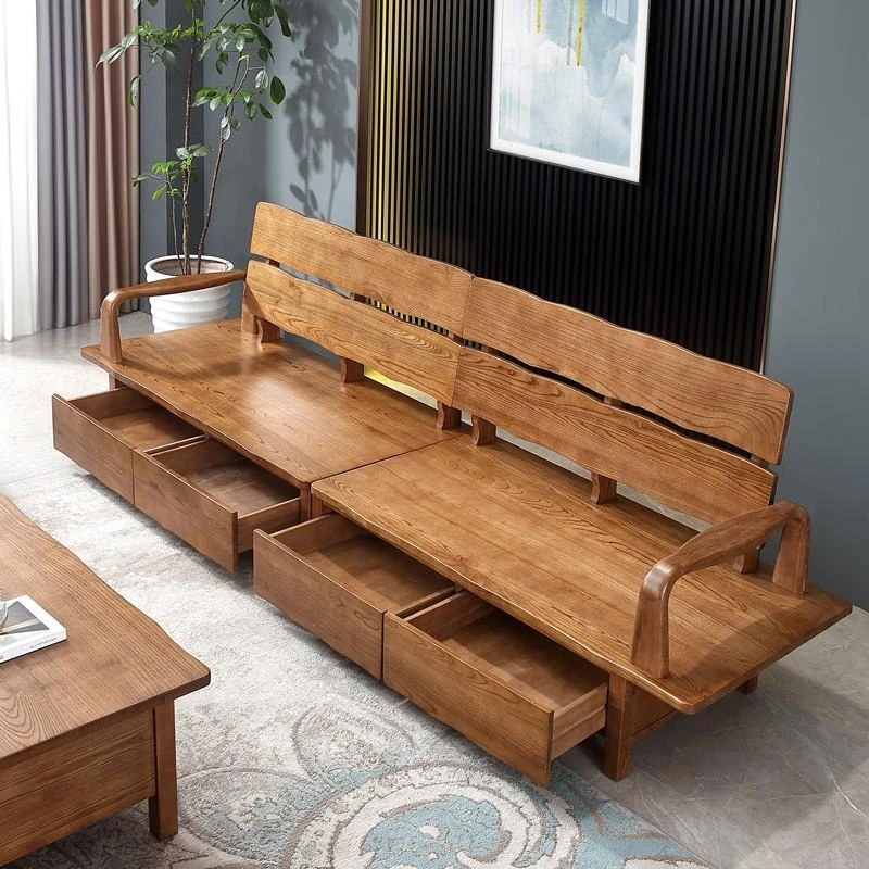 Nordic Ash Wood Solid Sofa - Versatile Winter & Summer Storage Sofa for 3-4 People, Japanese Style with Large Wooden Board & Drawer Design
