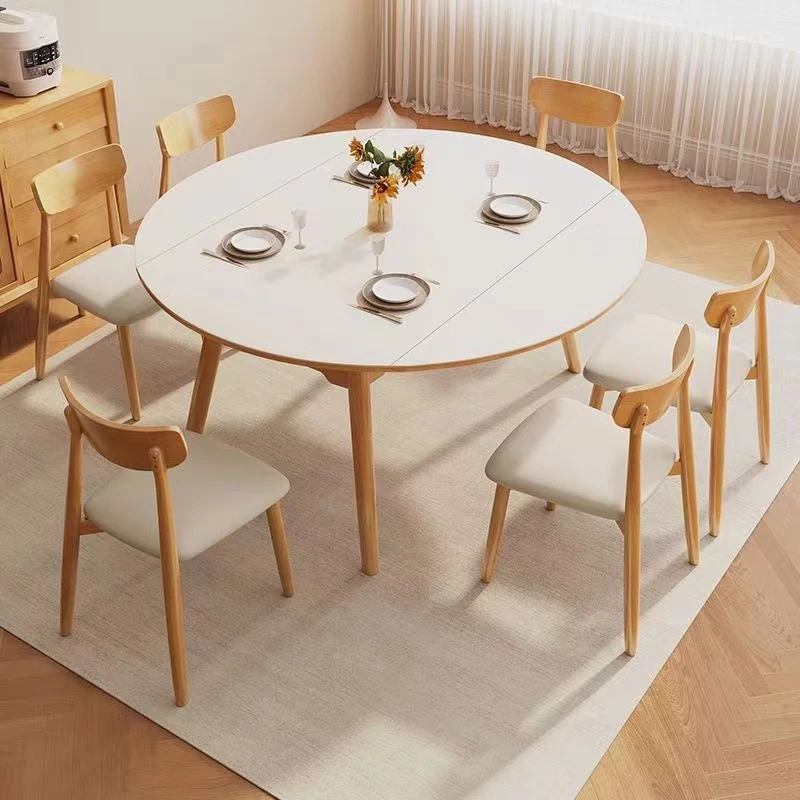 Elegant Solid Wood Cream Dining Table Set with Extendable Folding Design - Versatile Round/Square Table for Small Spaces, Minimalist Style with Durable Rock Plate for Home Use