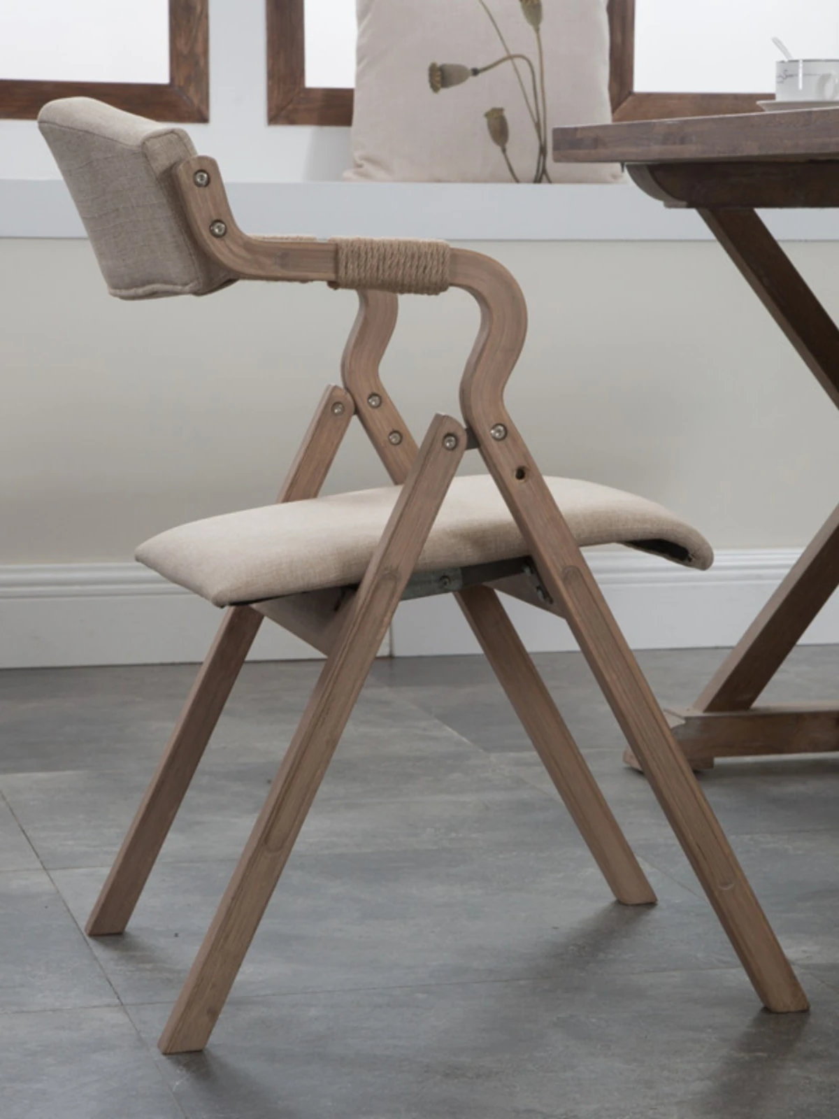 Vintage Minimalist Wooden Folding Armchair with Fabric Backrest - Perfect for Cozy Homes, Dining Rooms, and Study Spaces. Embrace the Wabi-Sabi Aesthetic!