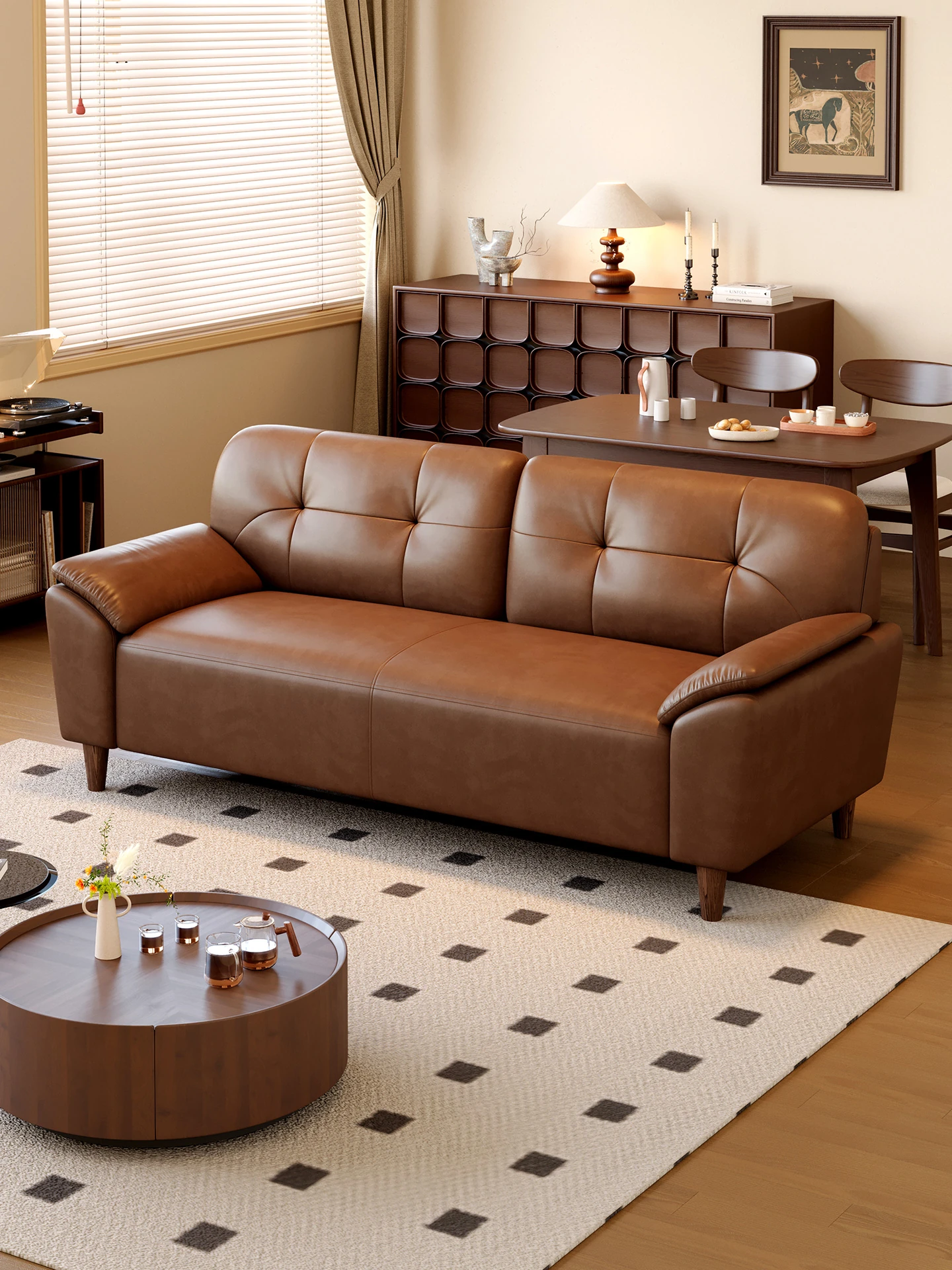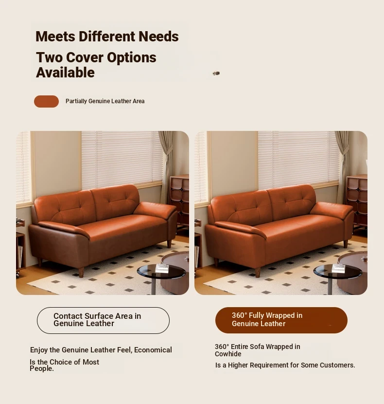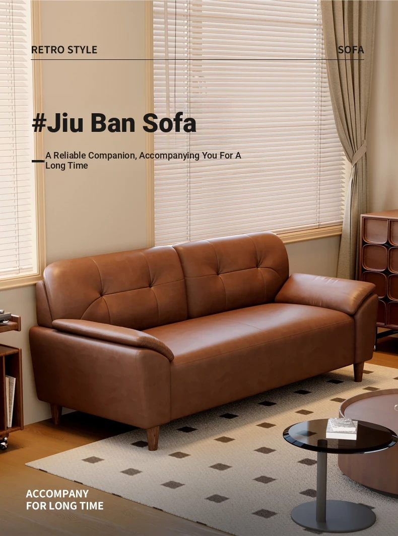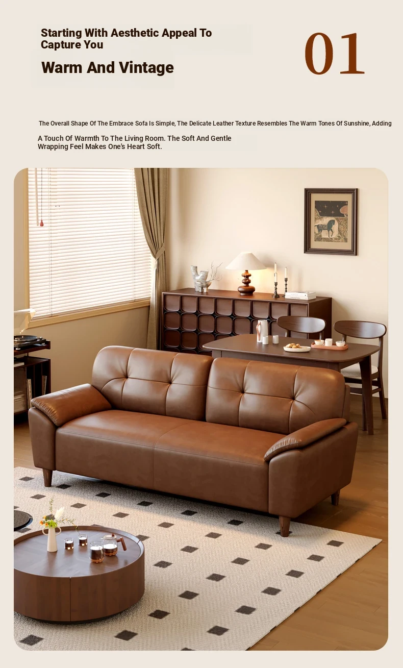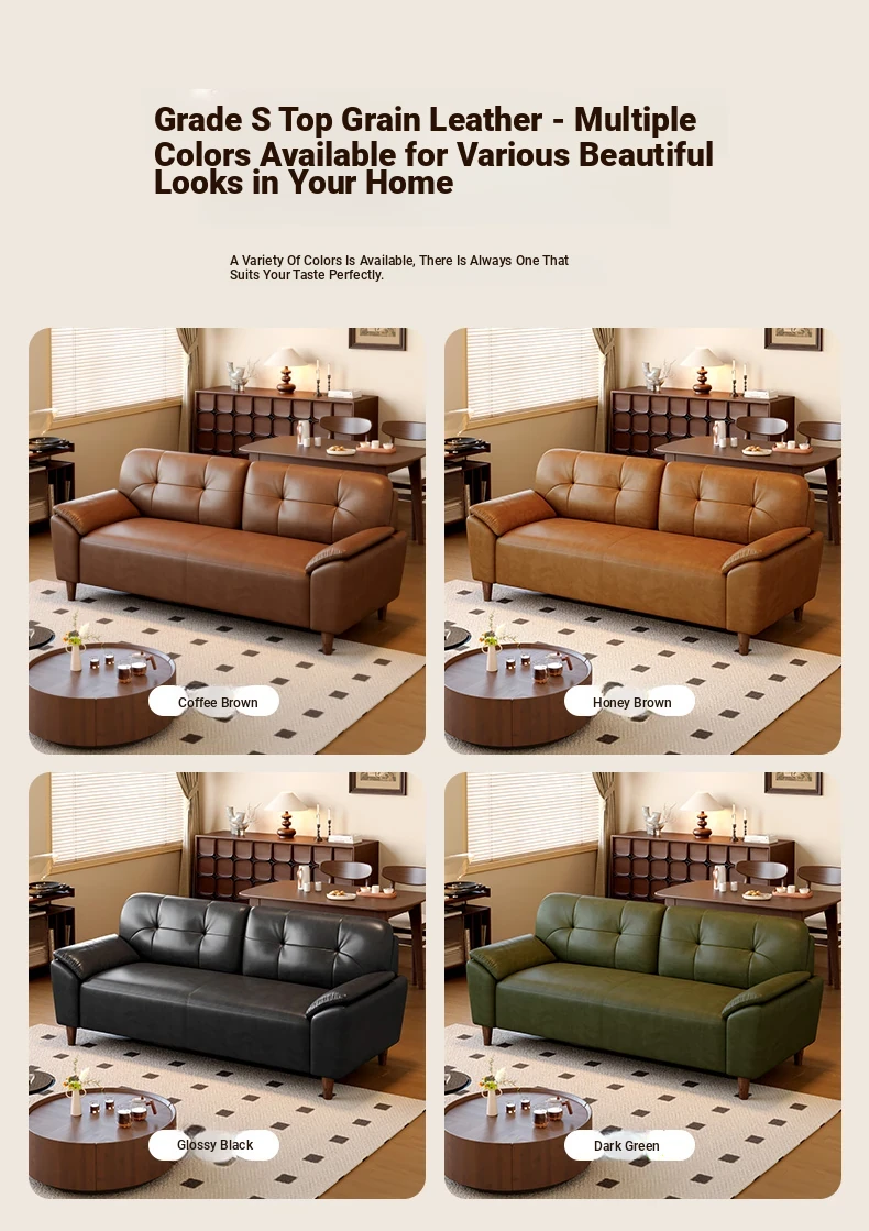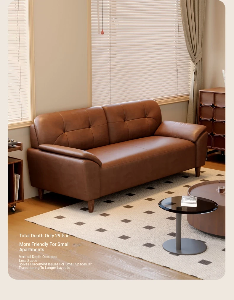 French Retro Waxed Leather Sofa - Compact 2-Seater Genuine Leather Couch for Small Spaces - Stylish 3-Person Cowhide Sofa for Living Room
