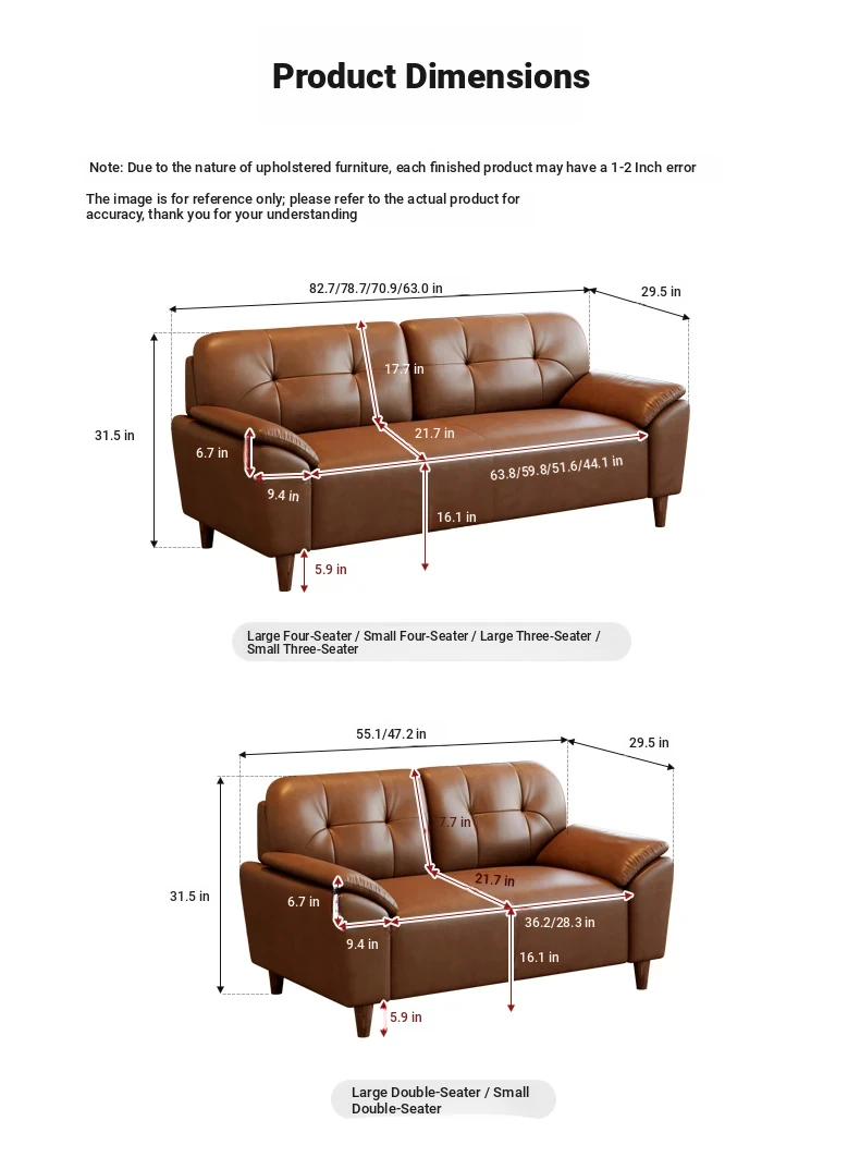 62.99 in small three-seat (all covered with oil wax top layer cow leather) with thicker latex + frame upgrade