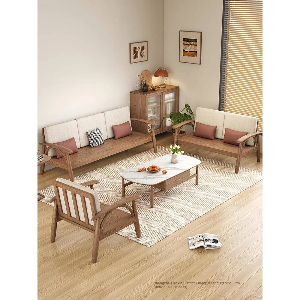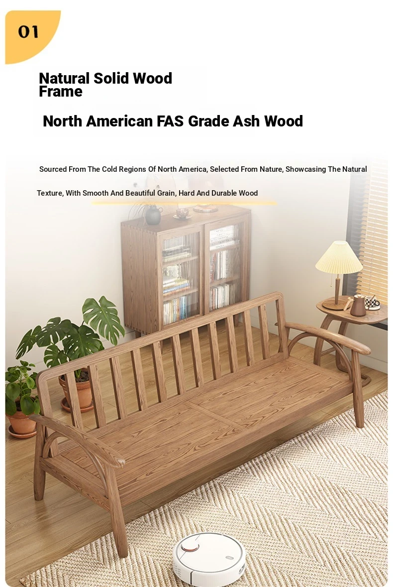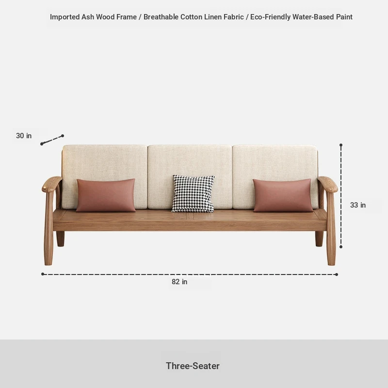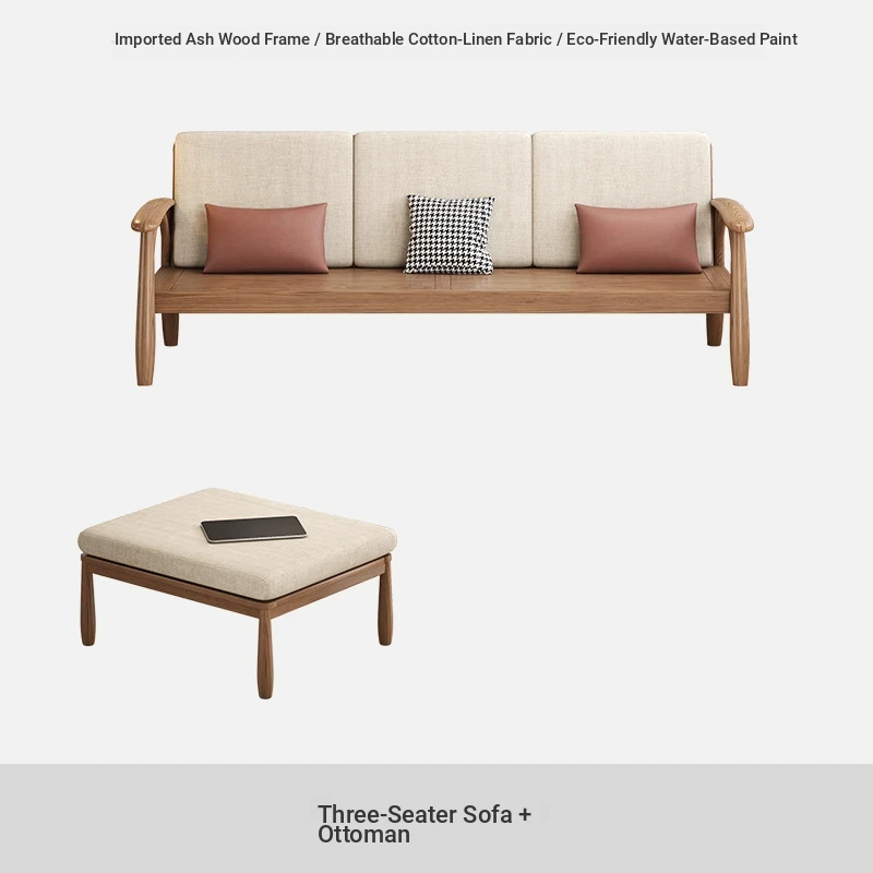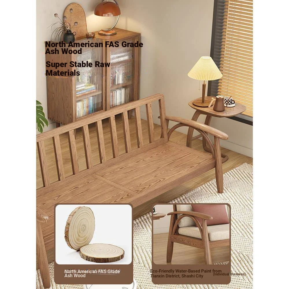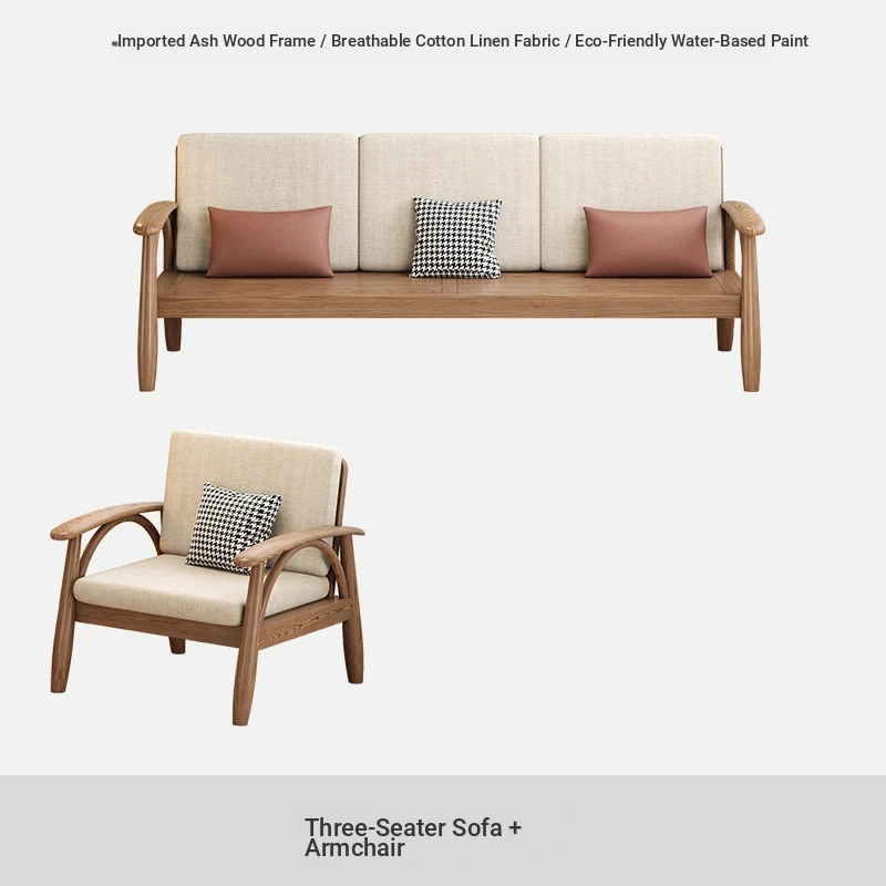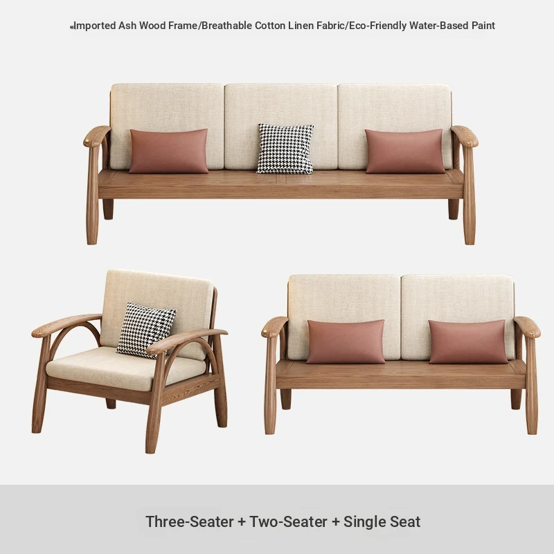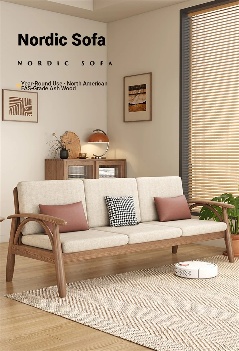 Solid Wood Sofa - Modern Nordic Style Three-Seat Couch for Small Living Rooms, Made of Ash Wood, Simple and Elegant Furniture Set