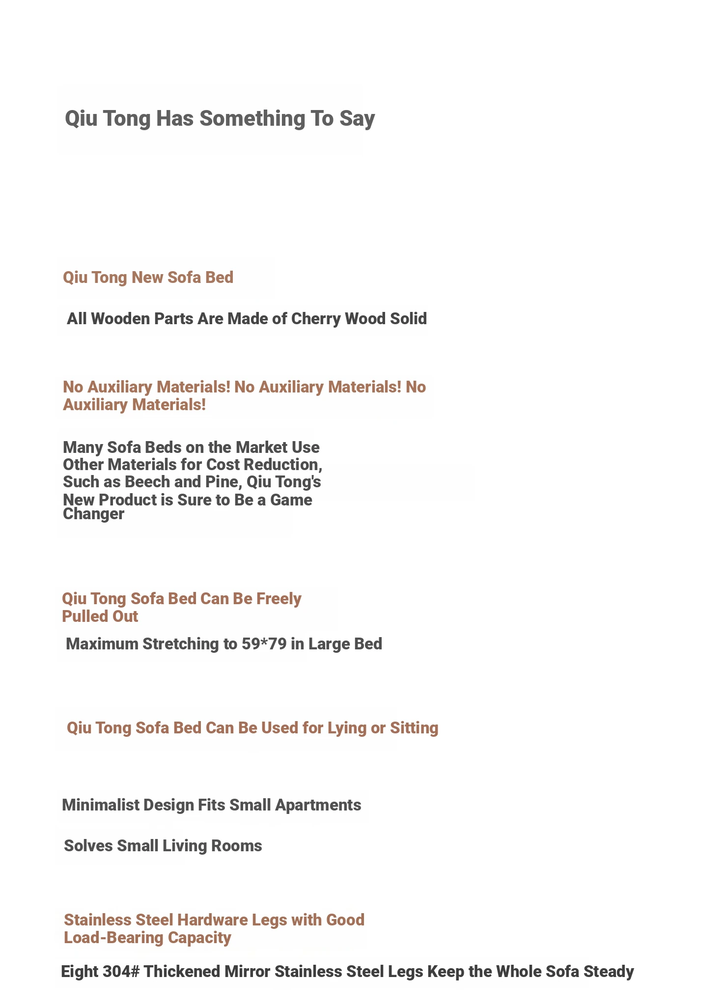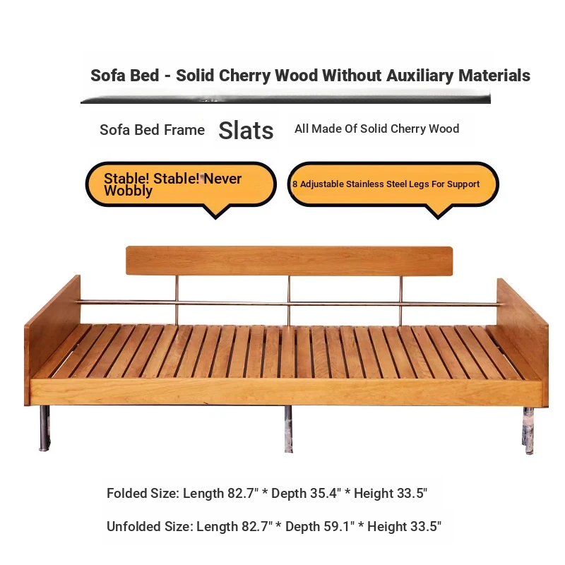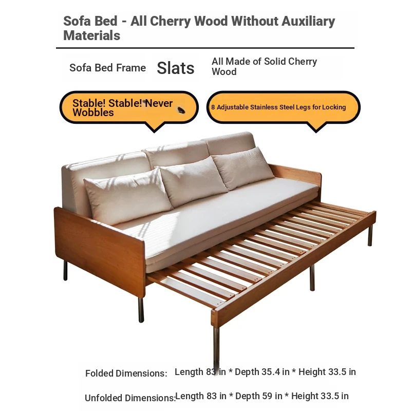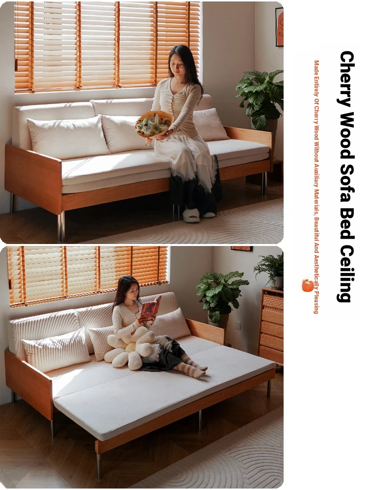 Cherry Wood Expandable Sofa Bed - Solid Wood, Pull-Out Design, Perfect for Small Spaces, Versatile 3-Seater for Sitting and Sleeping, Foldable and Space-Saving Solution.