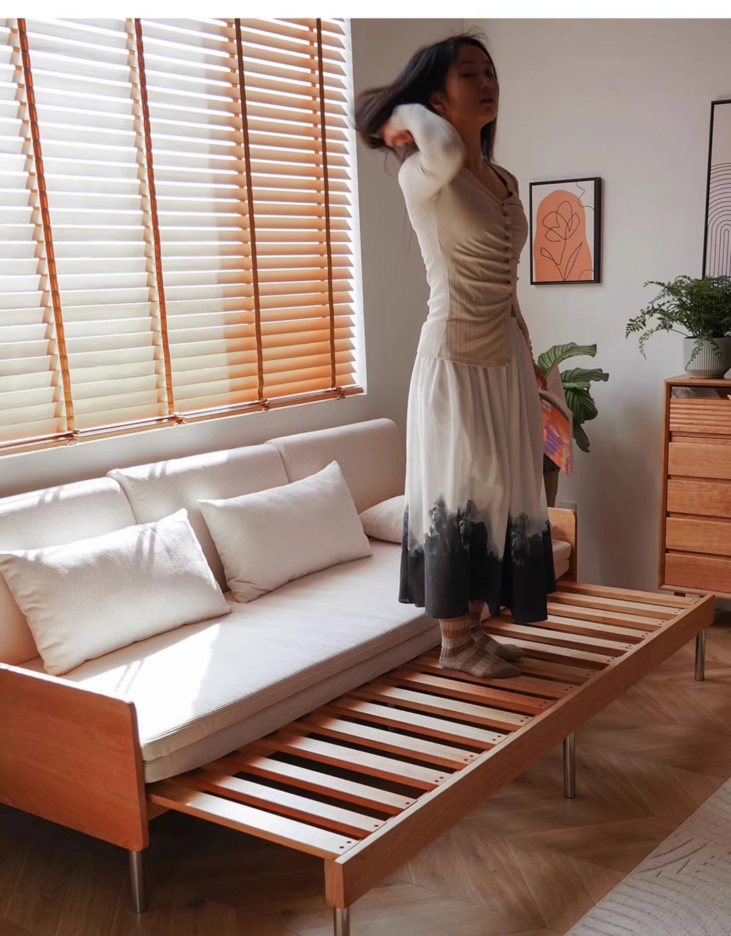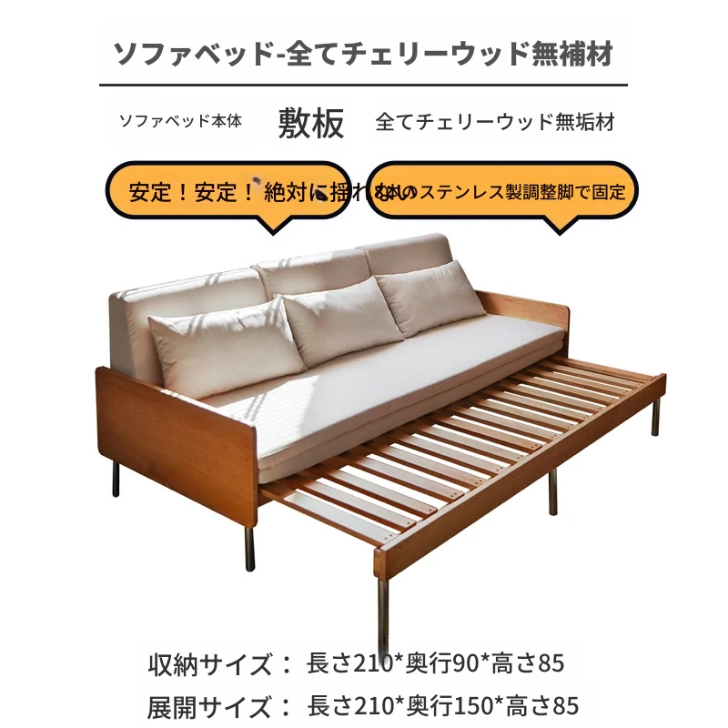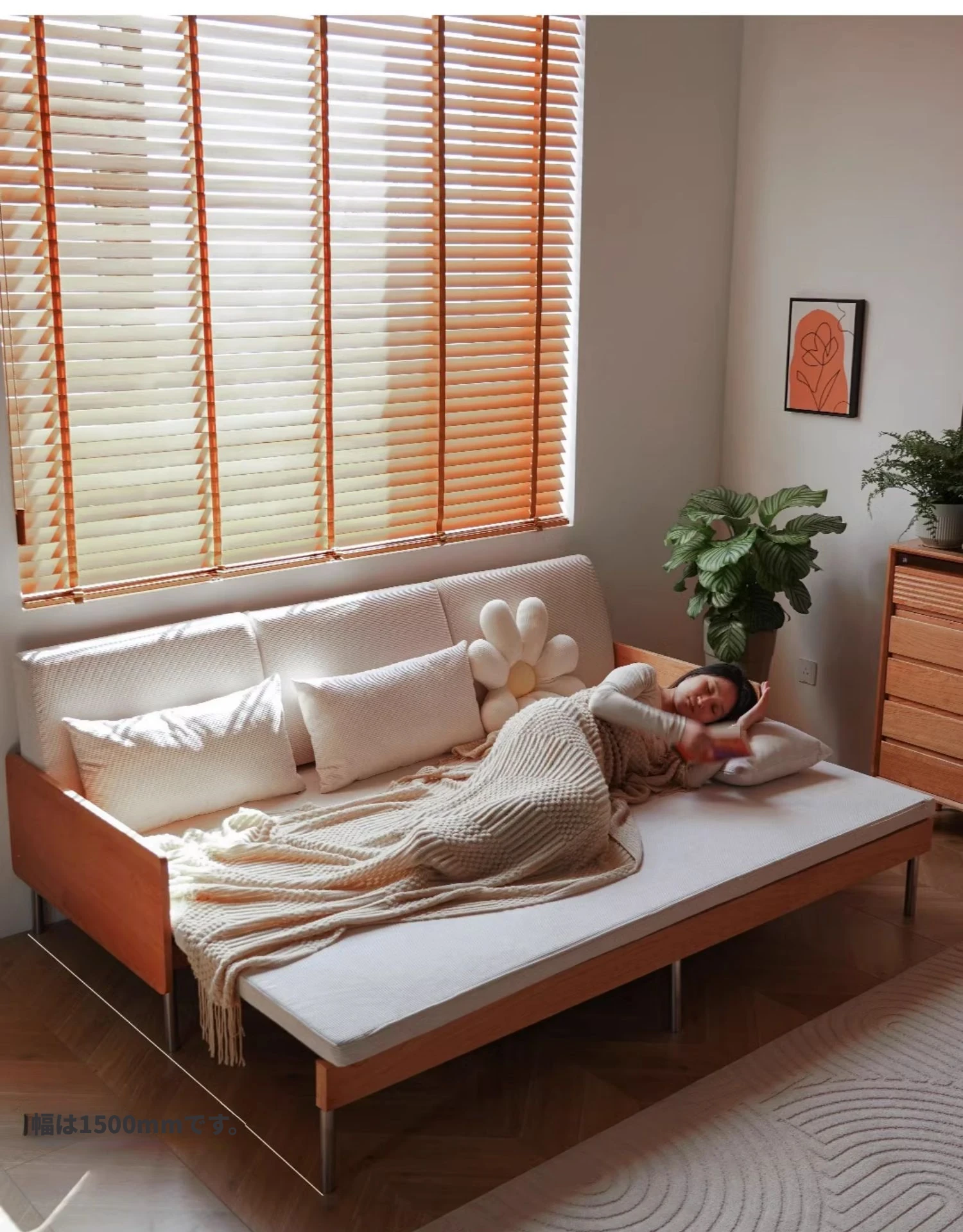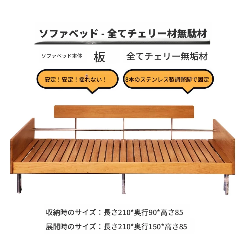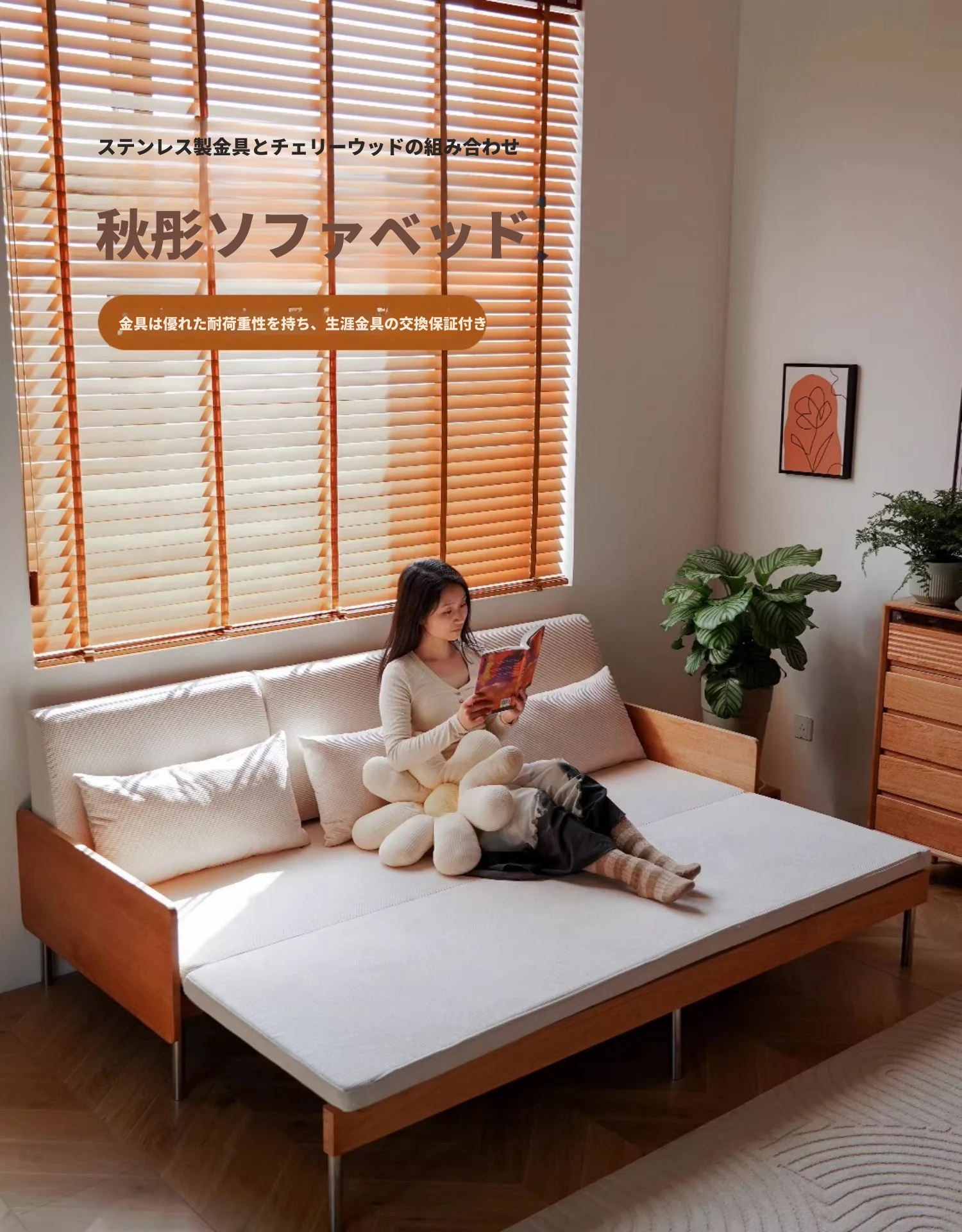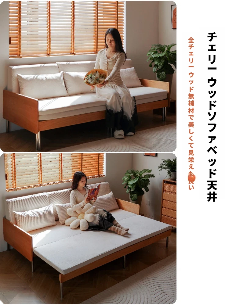 チェリーウッド製スライド式ソファベッド|全木製・コンパクトな3人用・座っても寝ても快適な折りたたみソファ|小スペースにぴったり!