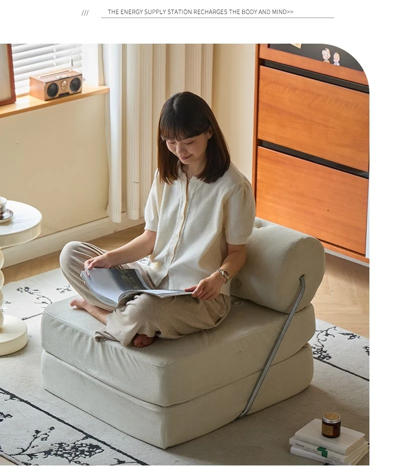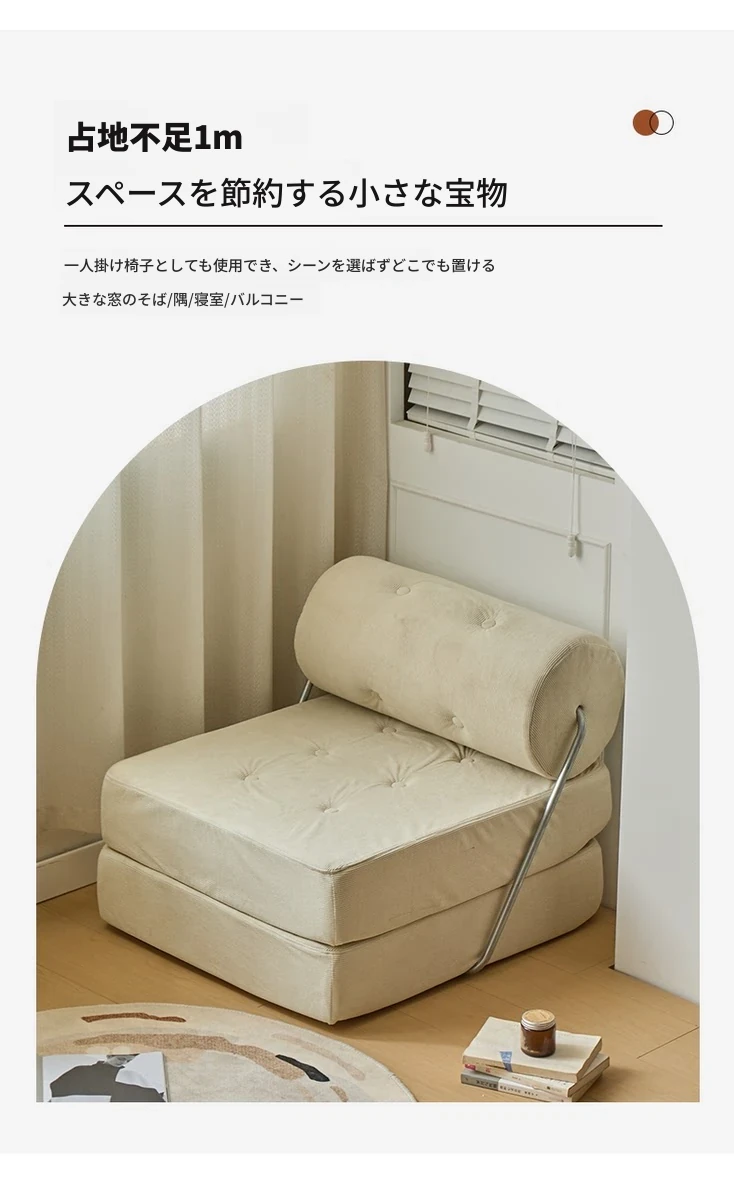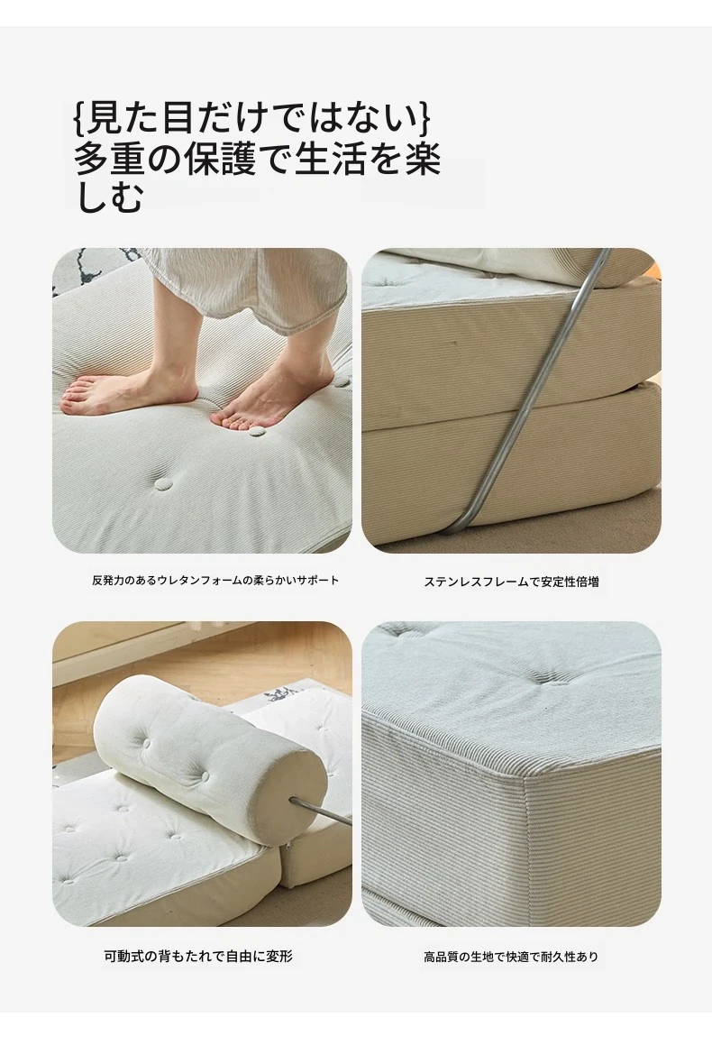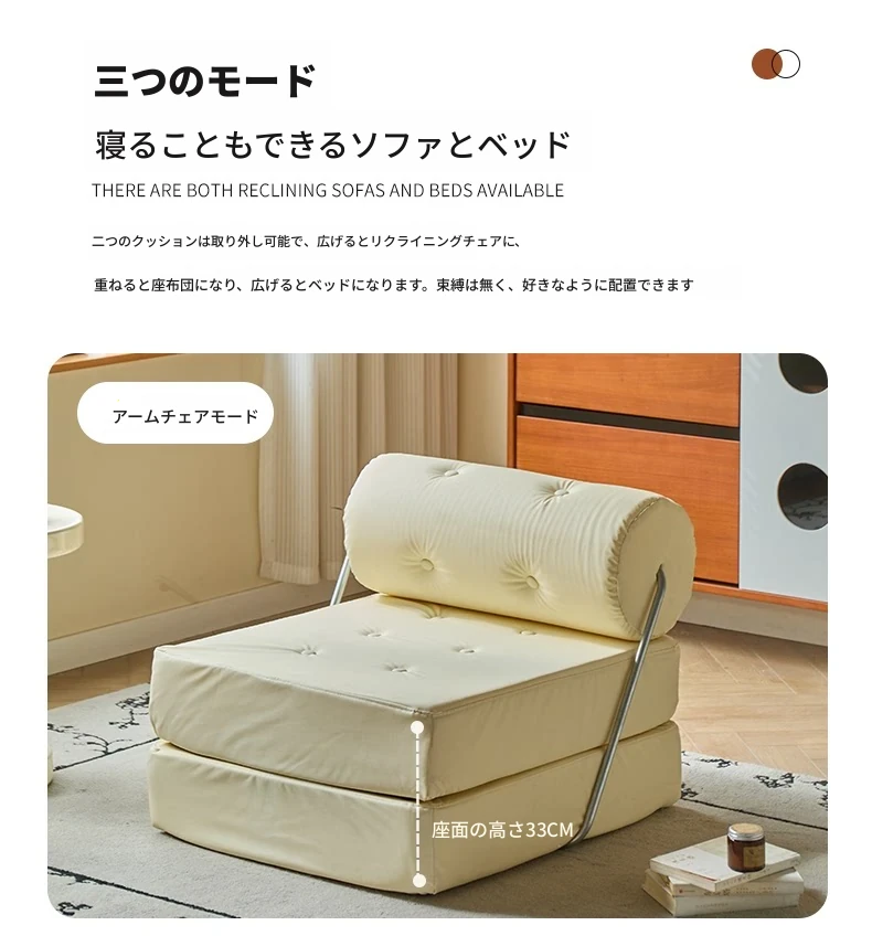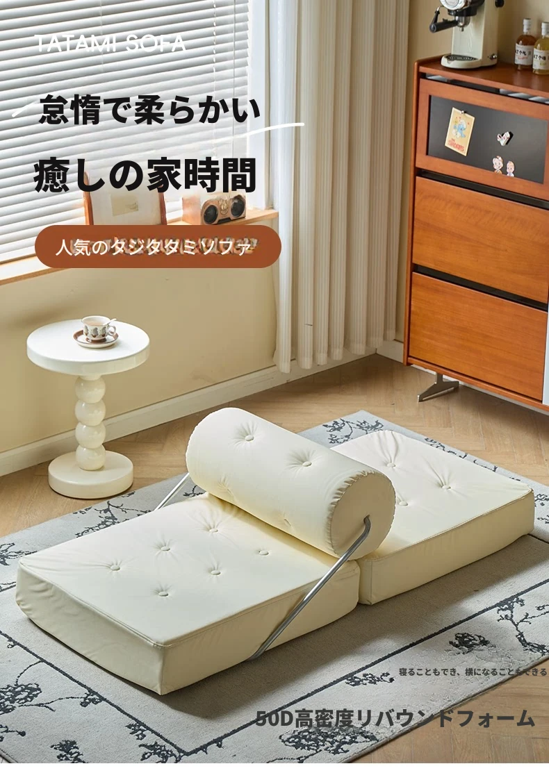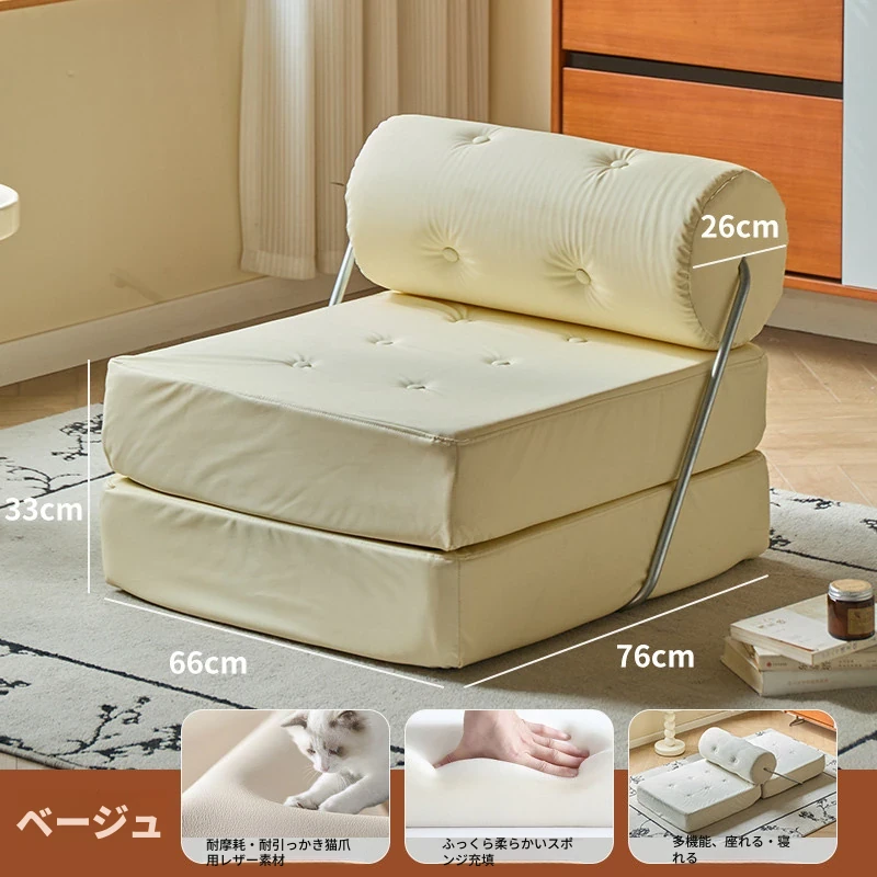 一人用折りたたみソファベッド|コンパクトなリビングに最適!タジ豆腐ブロックデザインのラグジュアリーなくつろぎ空間を実現。クリーミーな風合いで、どんなインテリアにもマッチ!
