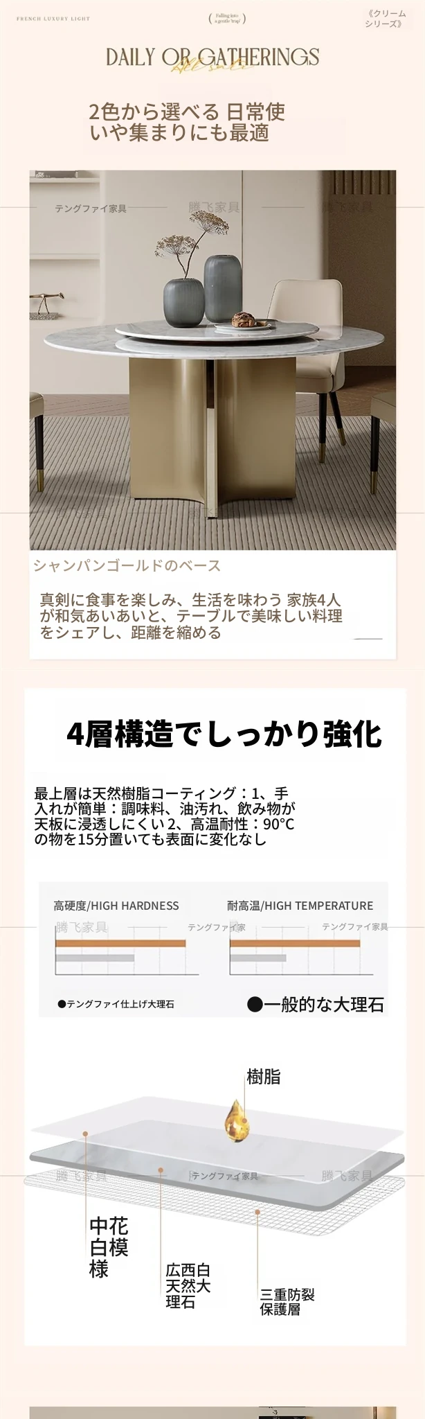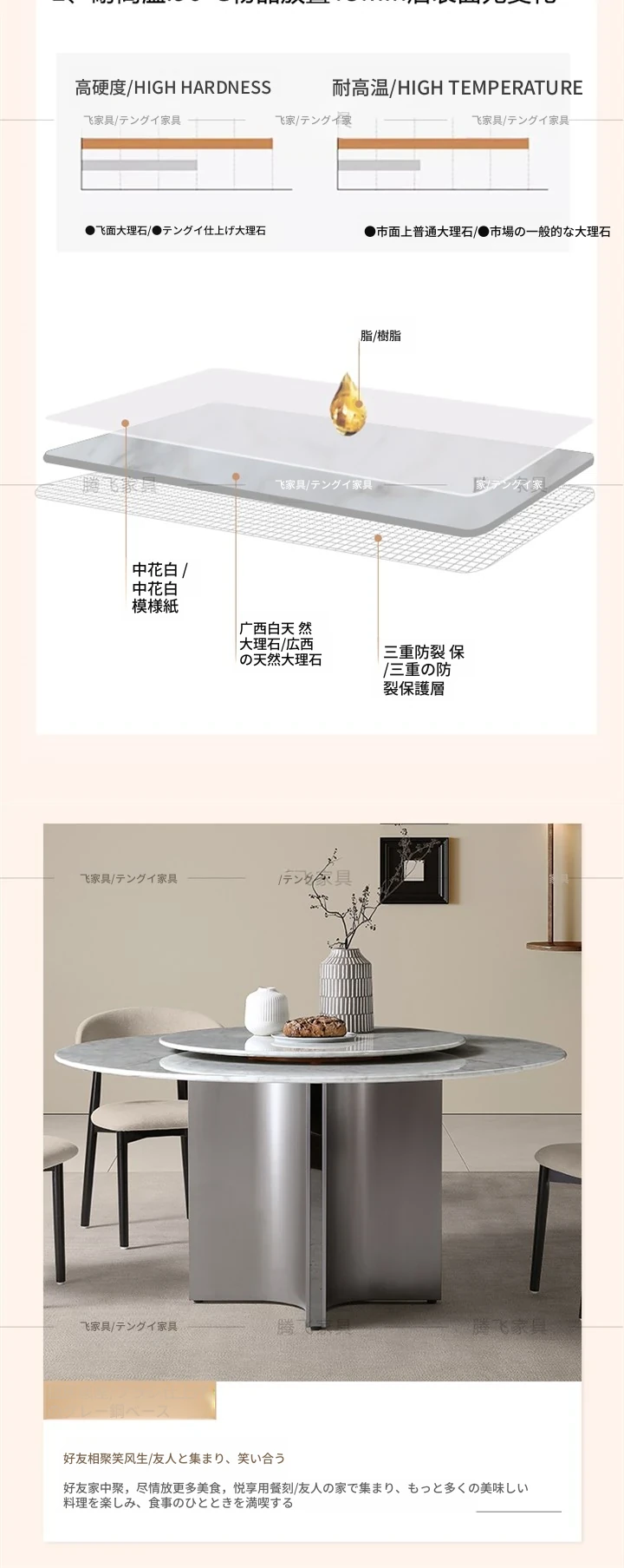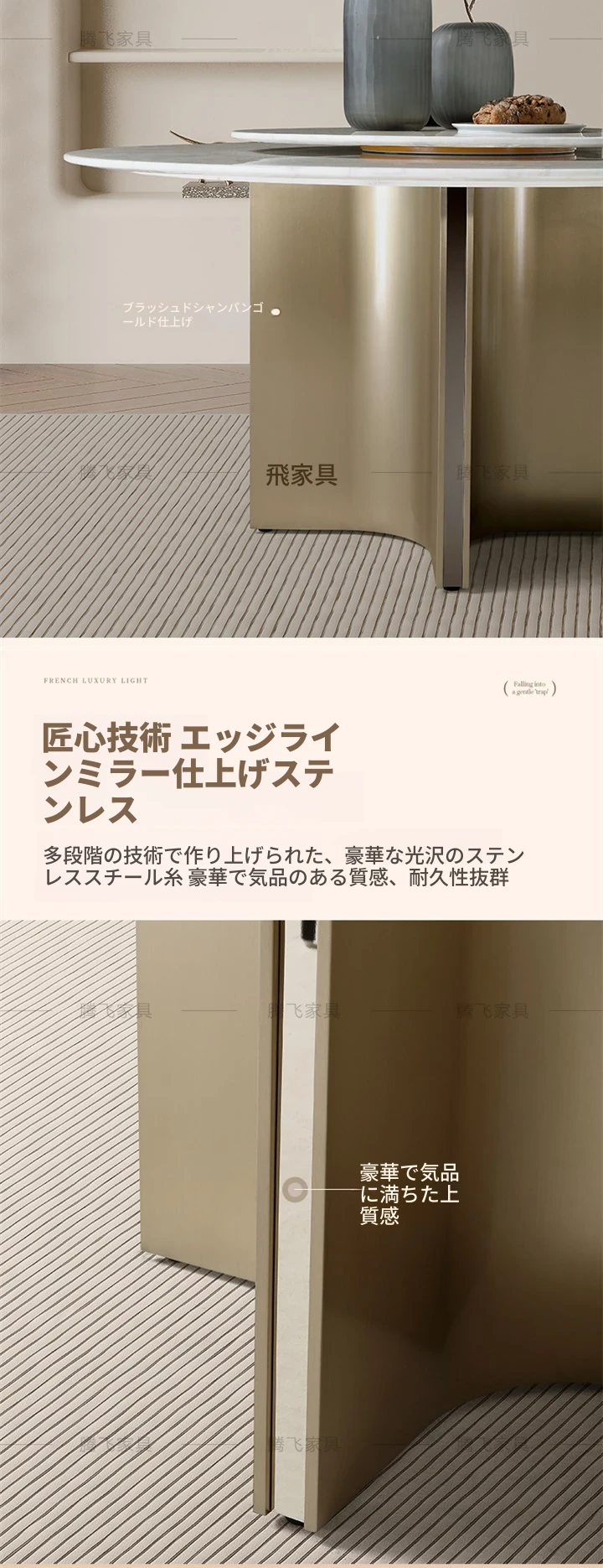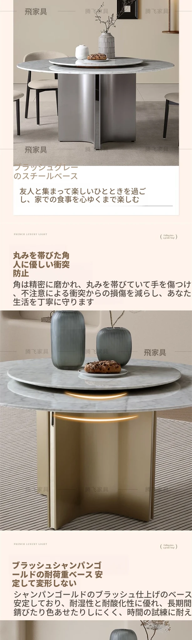 軽やかなラグジュアリー感のあるクリーム色ステンレススチール金色大理石の円形テーブル。モダンでシンプルなデザイン、回転プレート付きで、人気のKレストランにも最適な家庭用ダイニングテーブルです。