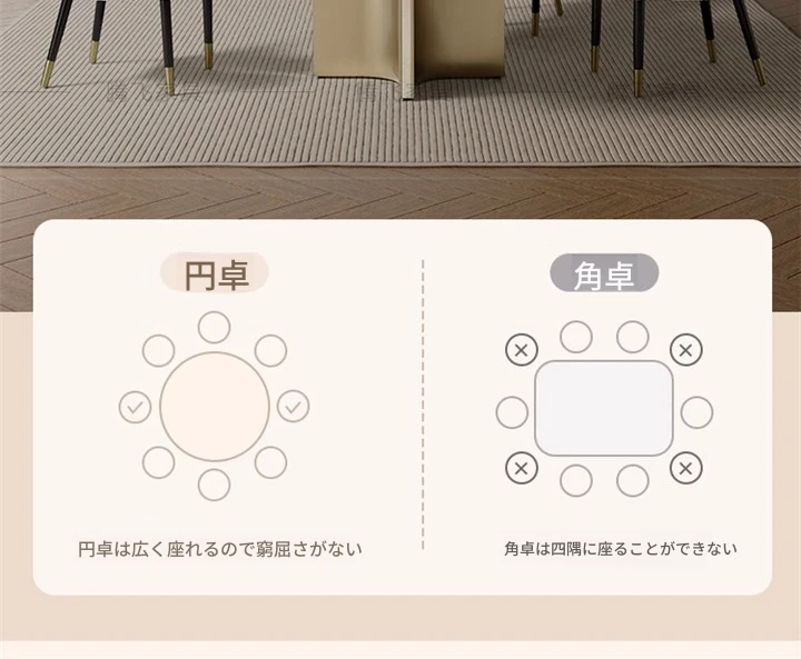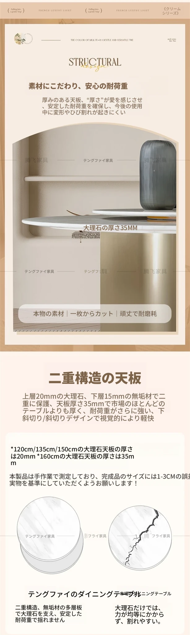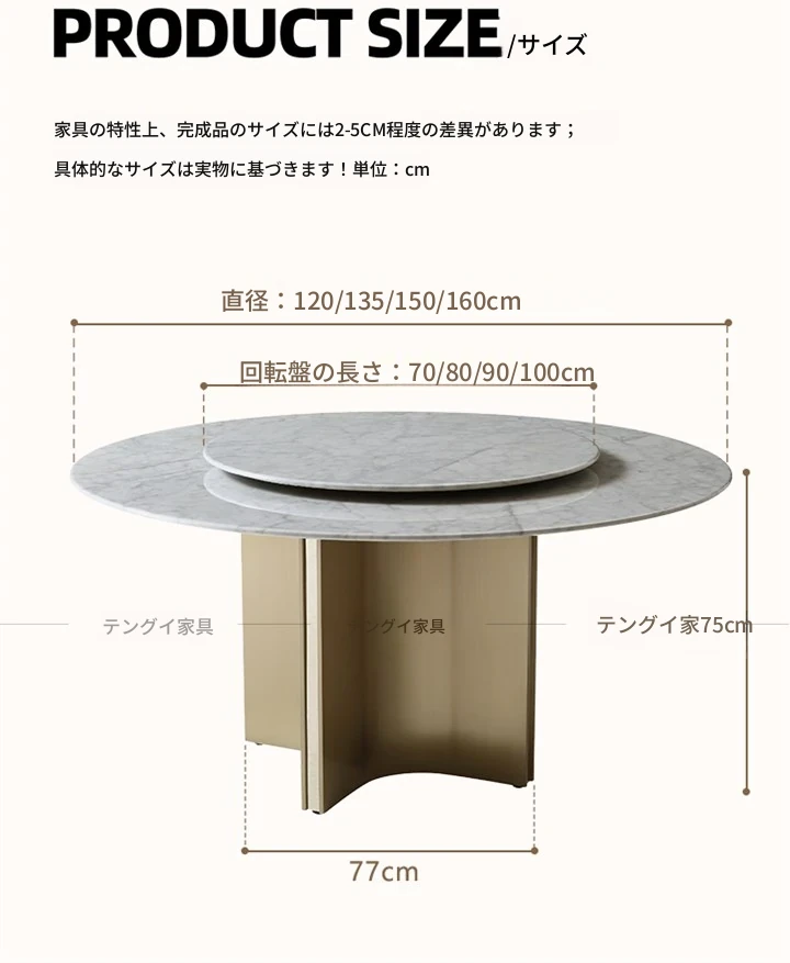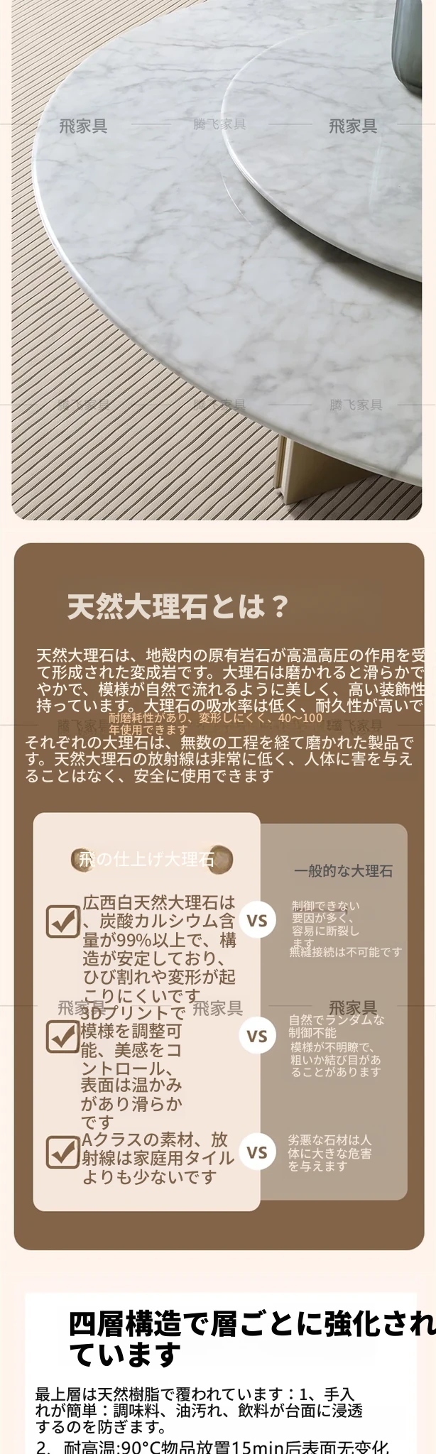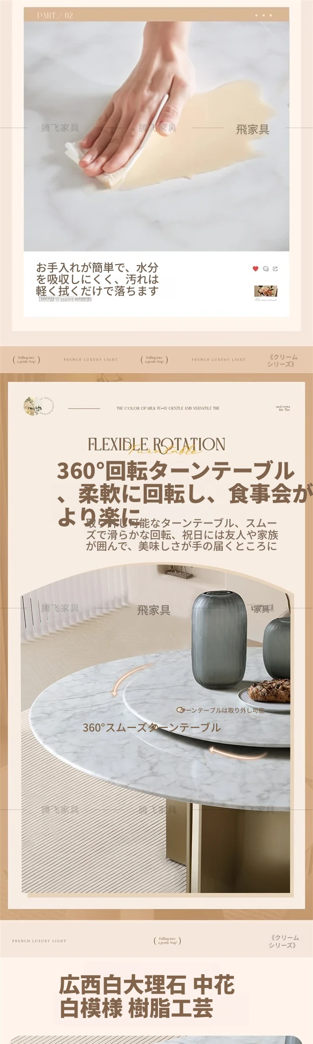 軽やかなラグジュアリー感のあるクリーム色ステンレススチール金色大理石の円形テーブル。モダンでシンプルなデザイン、回転プレート付きで、人気のKレストランにも最適な家庭用ダイニングテーブルです。
