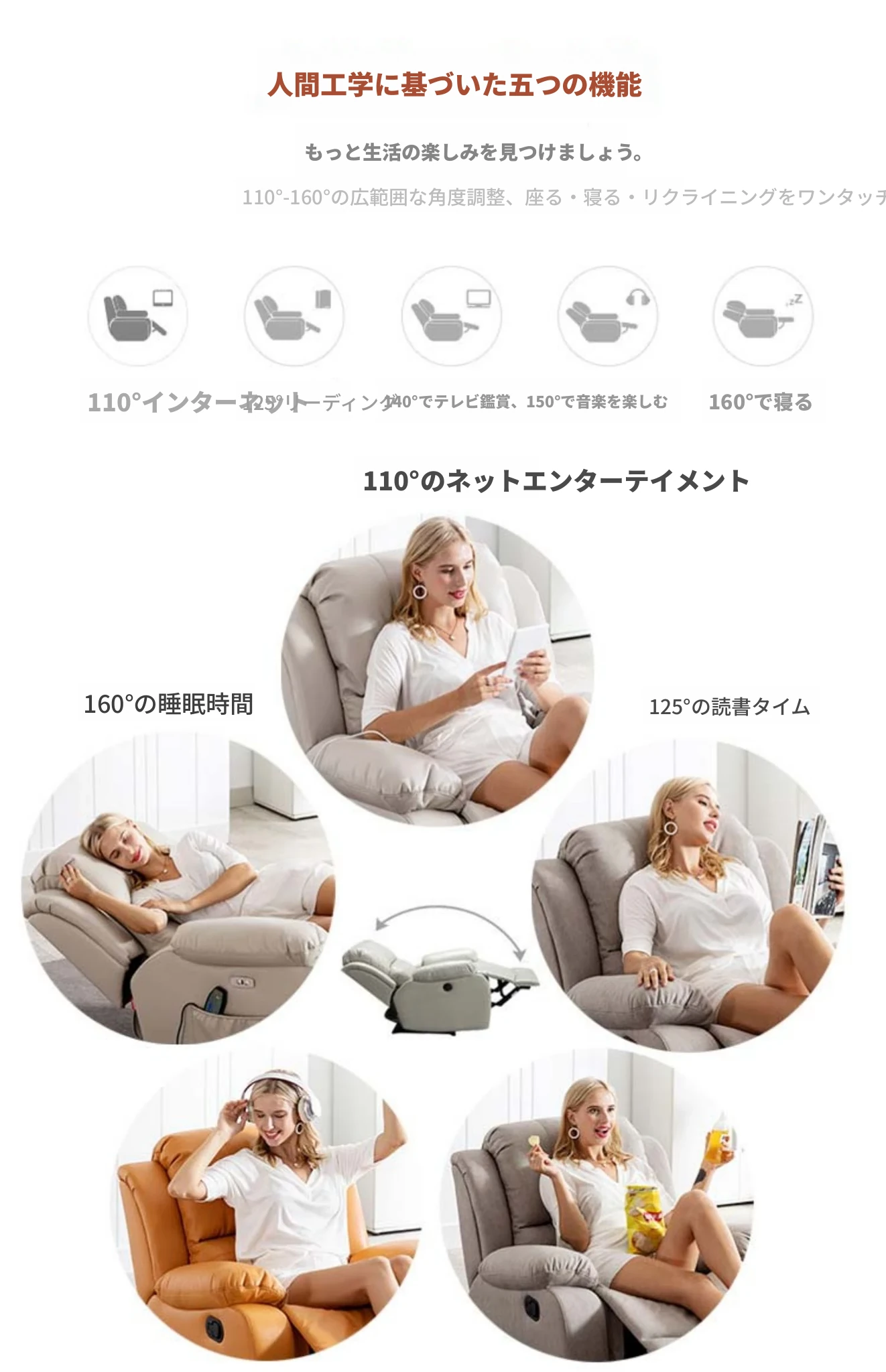 電動ヘッドレスト付き人気の一人用ソファ!リラックスできるスペースにぴったりの多機能ロッキングチェア。リビングやバルコニーに最適な、くつろぎのひとときを提供します!