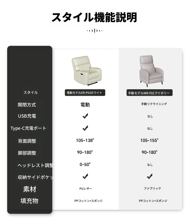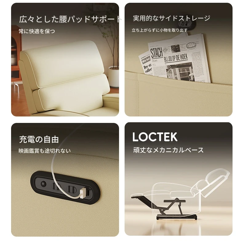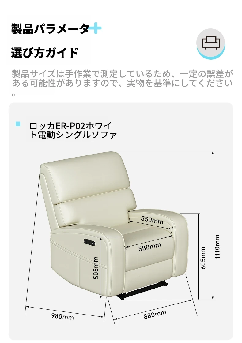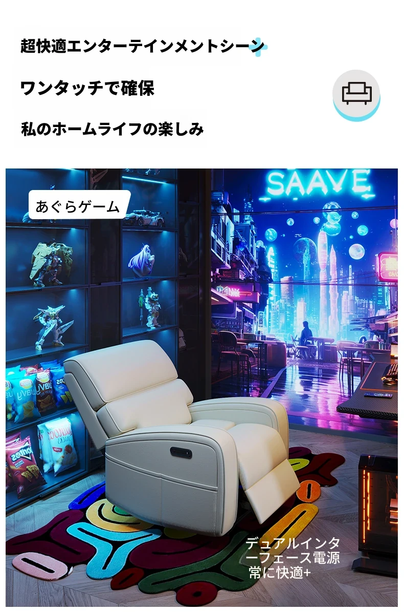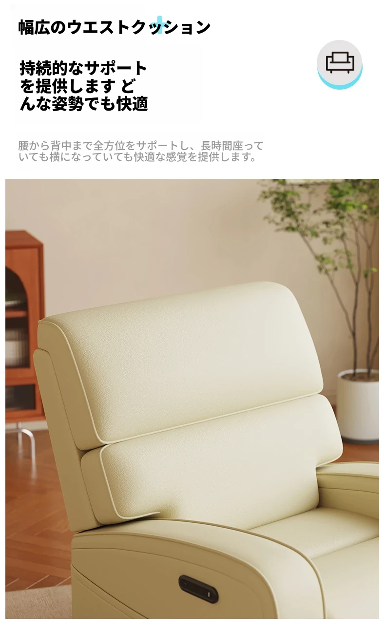 楽歌ER-P02/MR-F01多機能電動ソファ!環境に優しいPUレザー製で、リラックスできる快適な一人用ソファ。あなたの癒しの時間を提供します。おしゃれでスタイリッシュなデザイン、居心地抜群のリクライニングチェア!