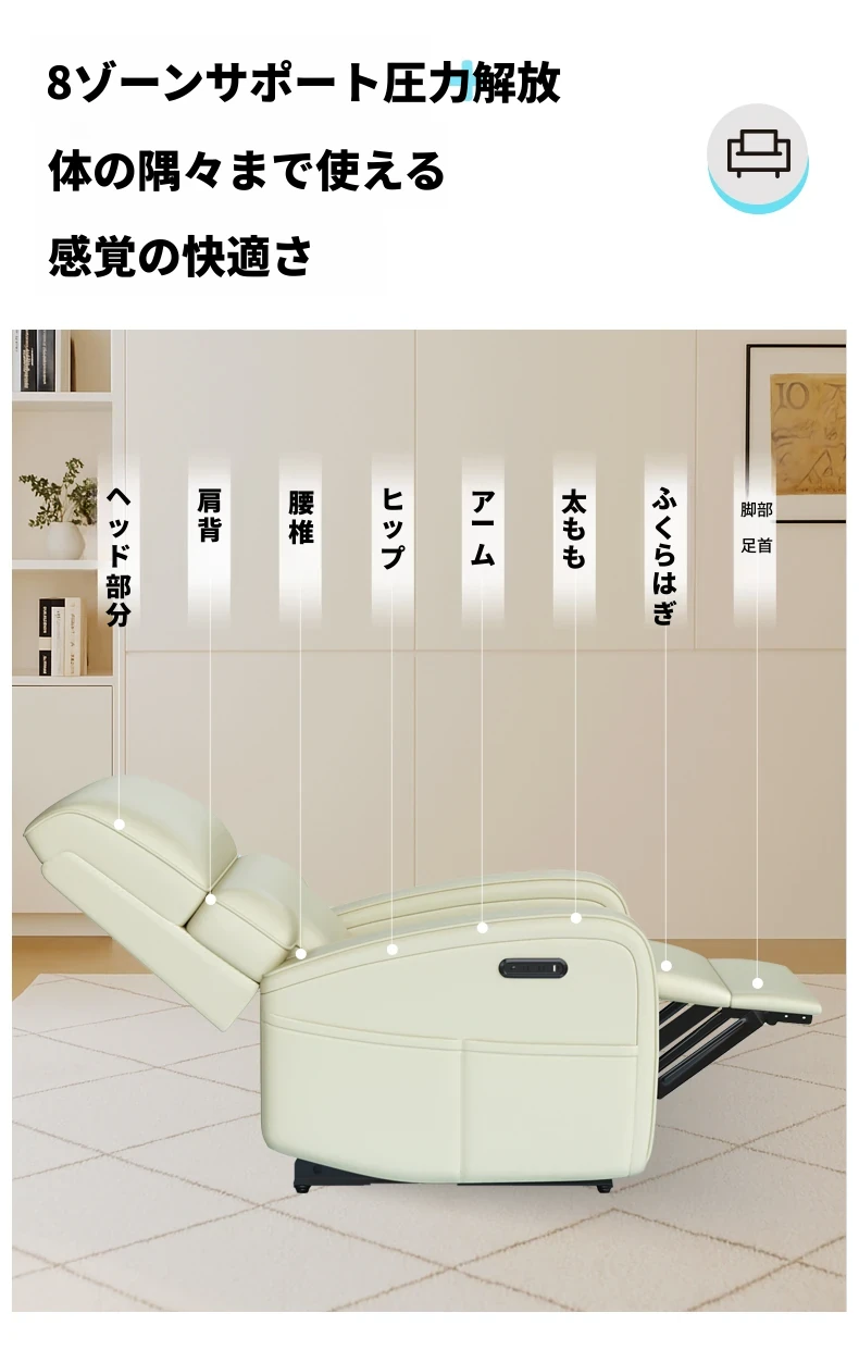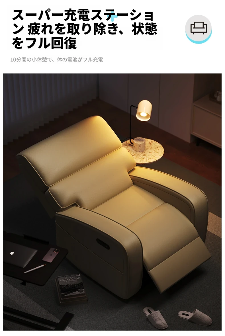 厳選された高級スペースカプセルソファ!一人用電動リクライニング、リビングに最適な小型デザイン。寝転んでリラックス、美容にも最適なネイルチェアとしても使えるマッサージ機能付き!