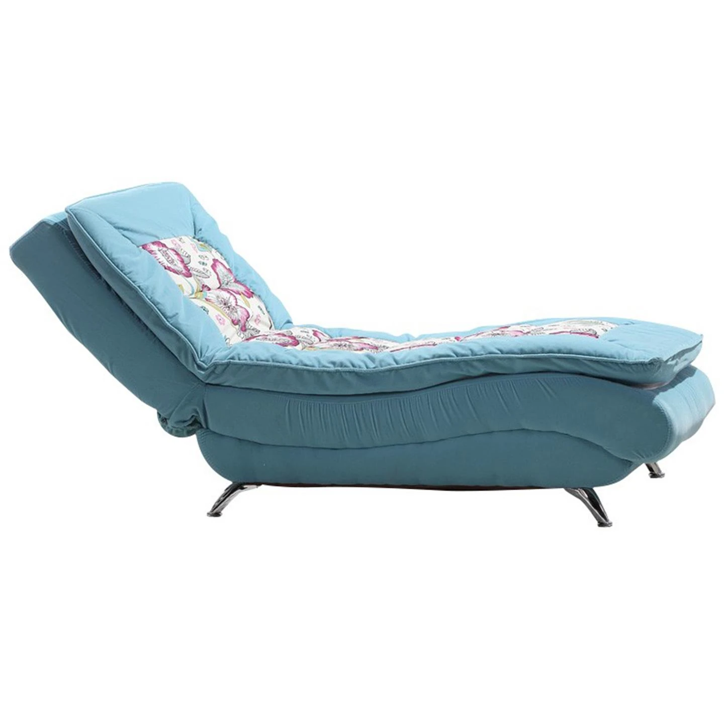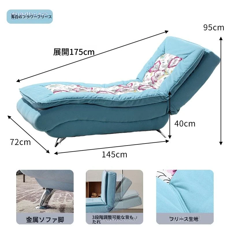 青と白のフラワーパターンのフリース素材、背もたれは三段階調節可能、宅配サービスあり。