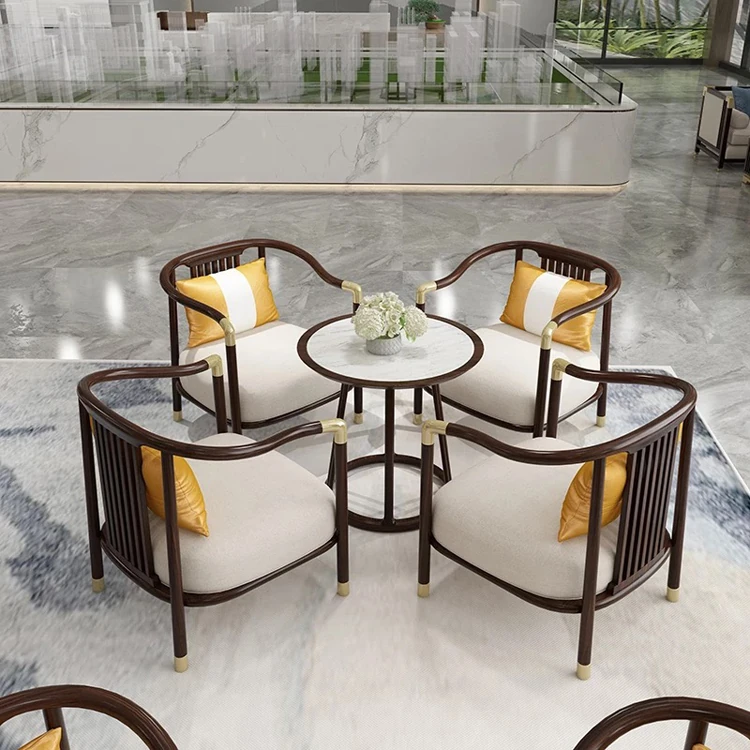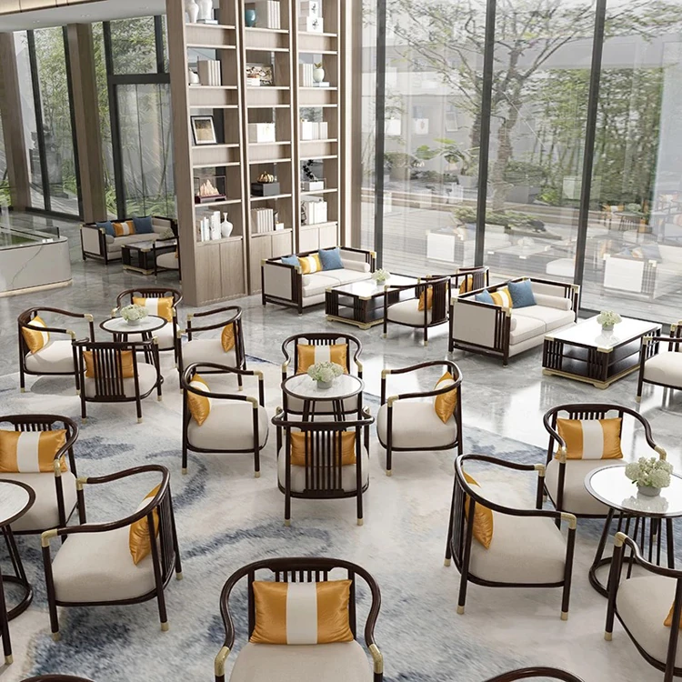 新中式スタイルの高級感あふれるソファセット!天然木使用のカスタムデザイン、洗練されたベンチとテーブル、ヴィラのリビングにぴったりな家具です。お客様を心地よく迎える空間を演出します!