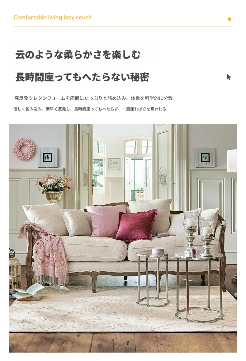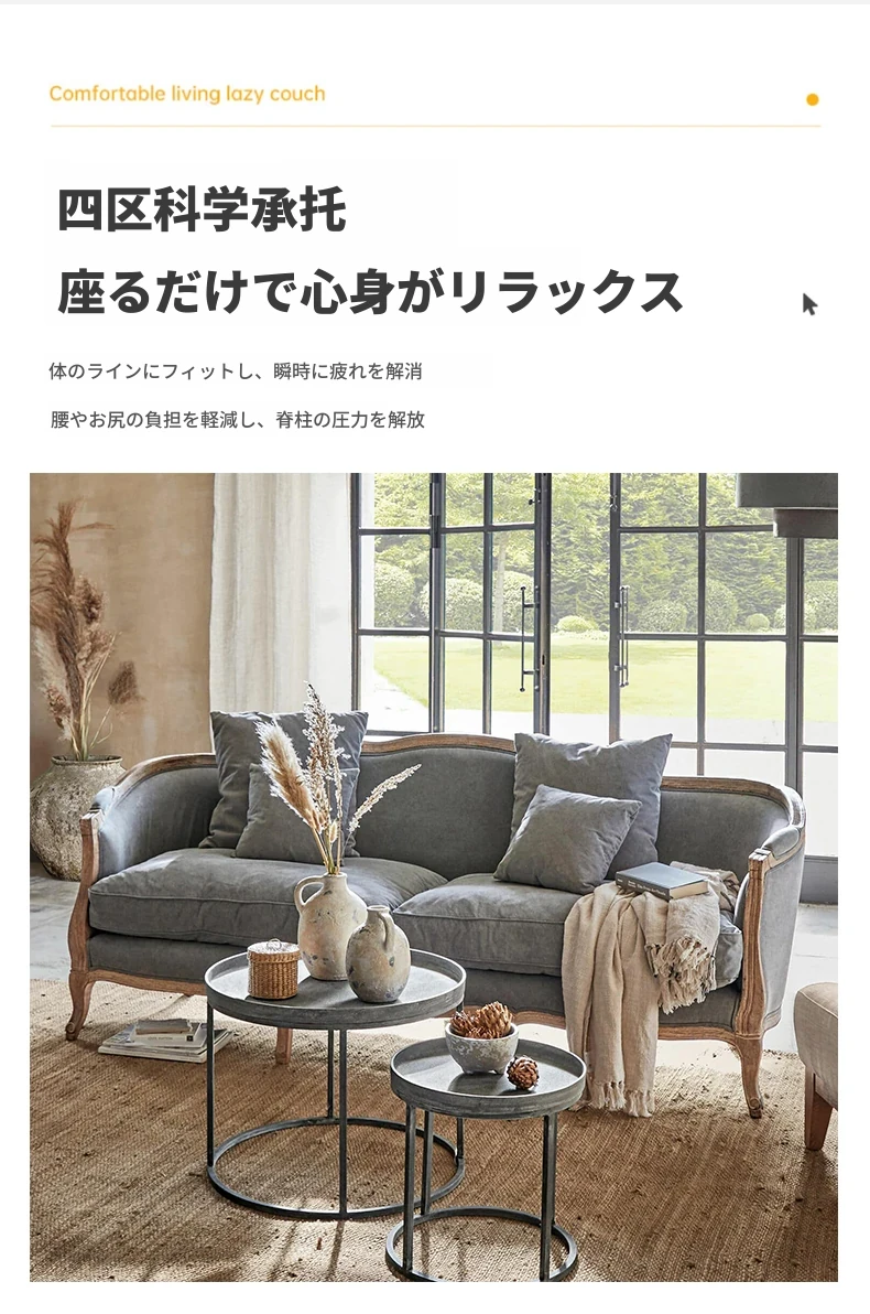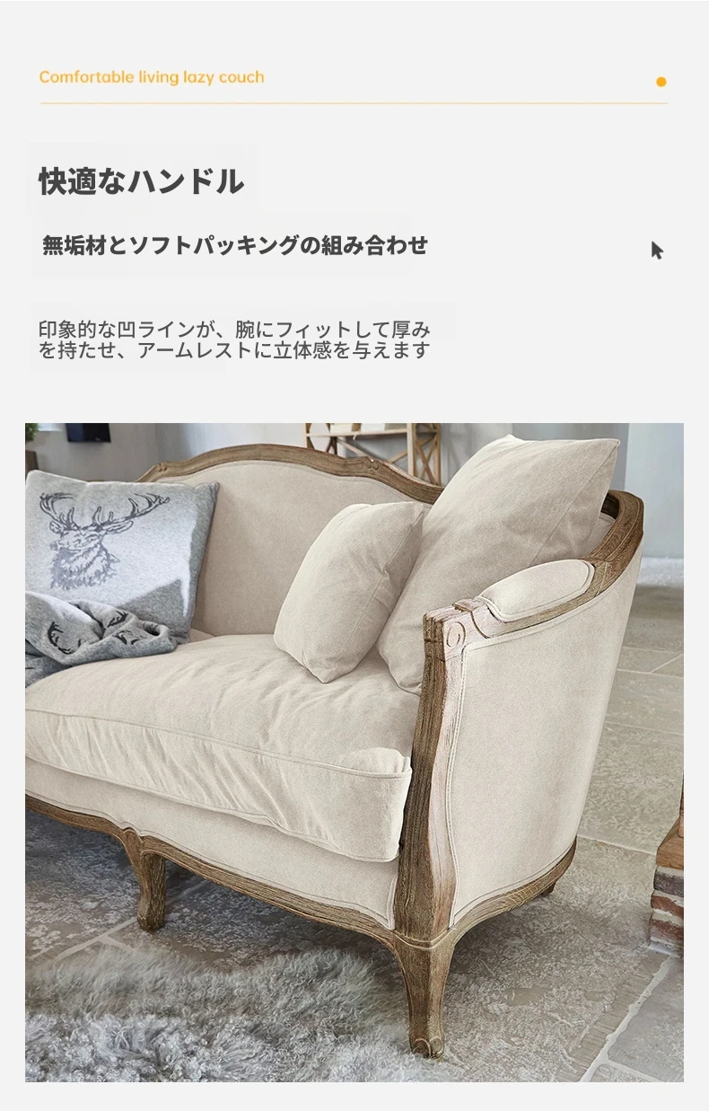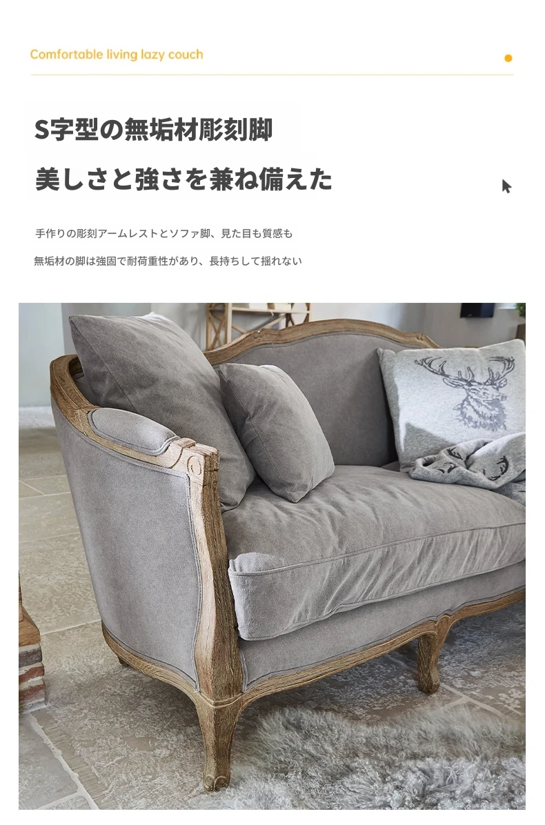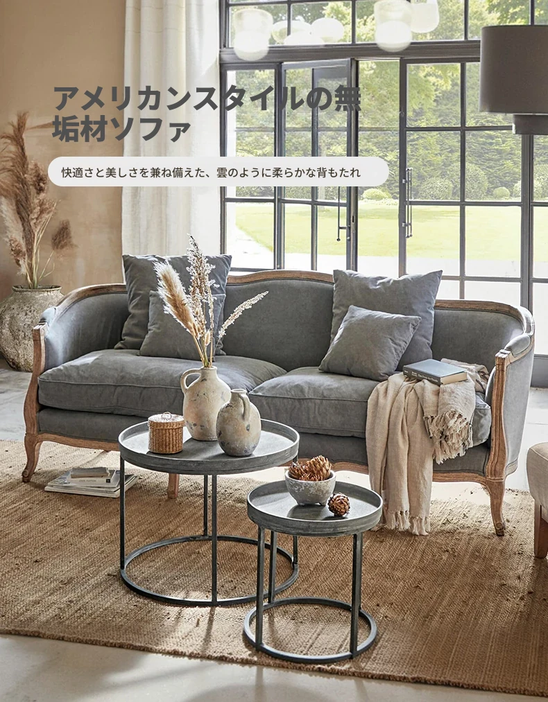 アメリカンカントリー風ヴィンテージスタイルの無垢材ソファ | 小型リビングにぴったり!フレンチデザインの2人掛け・3人掛け布製ソファセットで、快適さとおしゃれを同時に実現。お部屋を素敵に演出します!