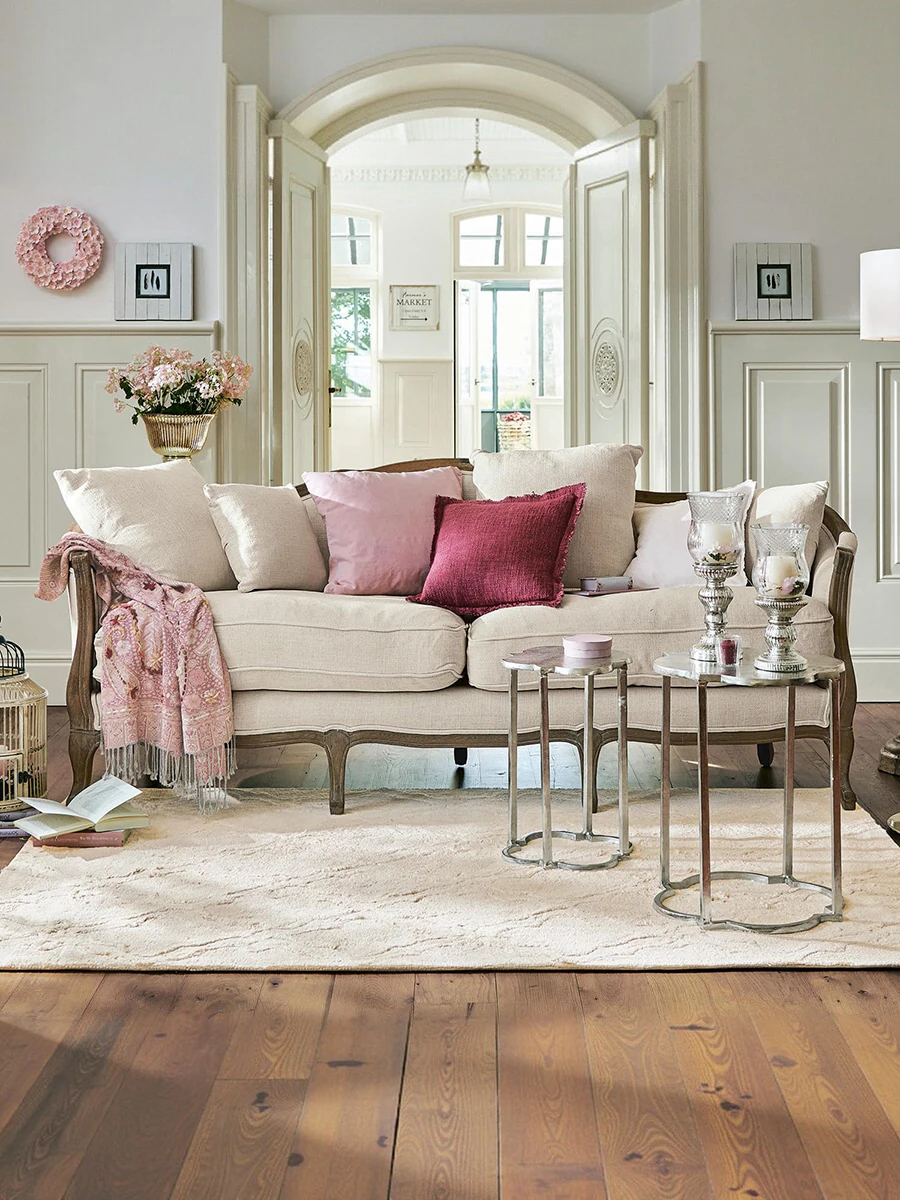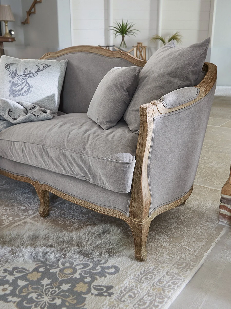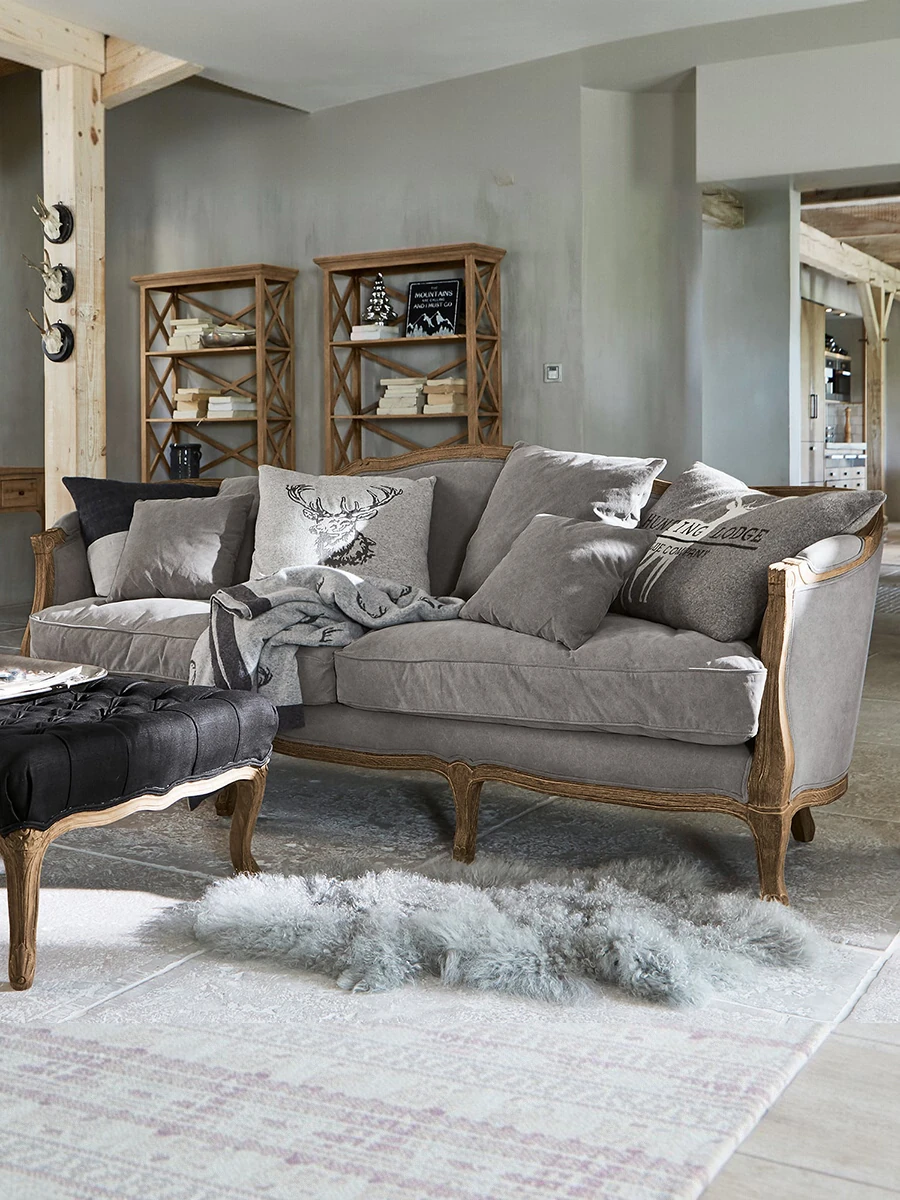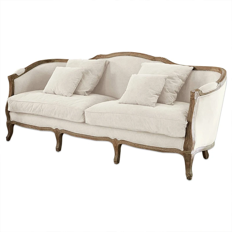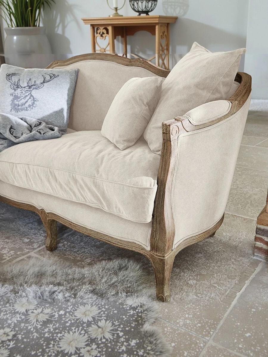 アメリカンカントリー風ヴィンテージスタイルの無垢材ソファ | 小型リビングにぴったり!フレンチデザインの2人掛け・3人掛け布製ソファセットで、快適さとおしゃれを同時に実現。お部屋を素敵に演出します!