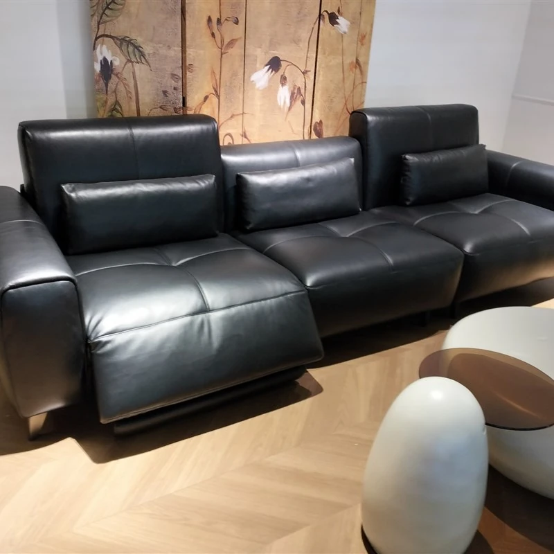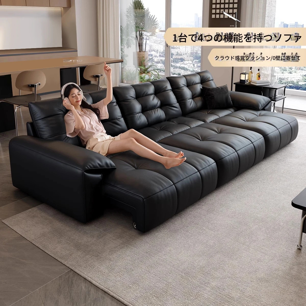 イタリアンミニマルデザイン モダンブラック電動ソファ 高級本革仕立て 多機能リビング用ソファ スタイリッシュな直線デザインで、快適なひとときを演出します。