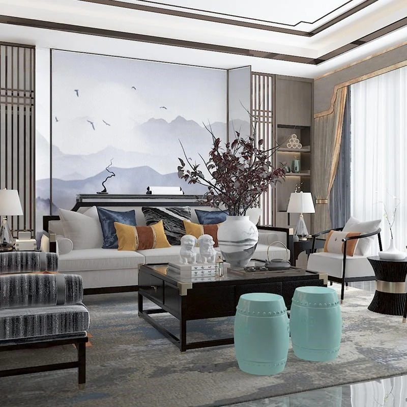 Elegant New Chinese Style Sofa Set - Solid Wood and Fabric Leather Combination for Villa Living Room, Ideal for Model Homes, Chic and Affordable Luxury Furniture